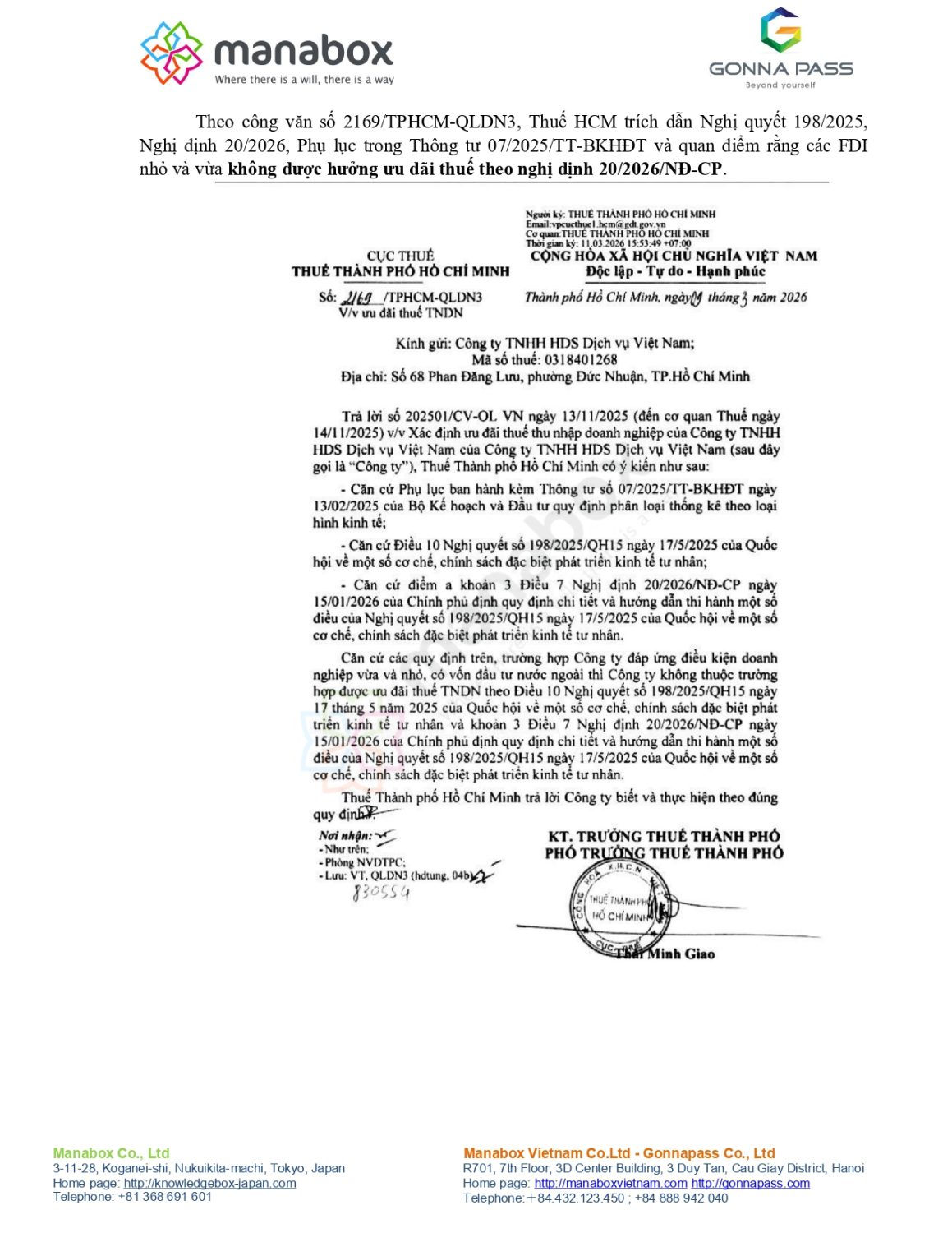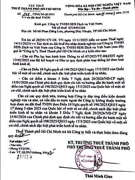 Cục Thuế TP. Hồ Chí Minh (Không áp dụng ưu đãi): Tại Công văn số 2169/TPHCM-QLDN3 ban hành ngày 11/03/2026, Cục Thuế TP.HCM đã trích dẫn Nghị quyết 198/2025/QH15, Nghị định 20/2026/NĐ-CP và Thông tư 07/2025/TT-BKHĐT để đưa ra kết luận rằng doanh nghiệp FDI vừa và nhỏ không thuộc diện được hưởng ưu đãi thuế TNDN theo Nghị định 20/2026/NĐ-CP. Công văn số 2169/TPHCM-QLDN3, theo đó, “kinh tế tư nhân” không bao gồm “kinh tế có vốn đầu tư nước ngoài”, do vậy các DN FDI không thuộc đối tượng điều chỉnh của NQ 68-NQ/TW, NQ 198/2025/QH15 và do vậy có thể không được hưởng ưu đãi thuế theo Nghị định 20/2026. Tuy nhiên, cũng có quan điểm cho thấy Nghị định 20/2026/NĐ-CP hướng dẫn NQ 198/2025/QH15 “về cơ chế, chính sách đặc biệt phát triển kinh tế tư nhân” và chỉ quy định áp cho các doanh nghiệp mà không xác định cụ thể là DN trong nước hay cả DN đầu tư nước ngoài (không có nội dung loại trừ ưu đãi cho các DN có vốn đầu tư nước ngoài).