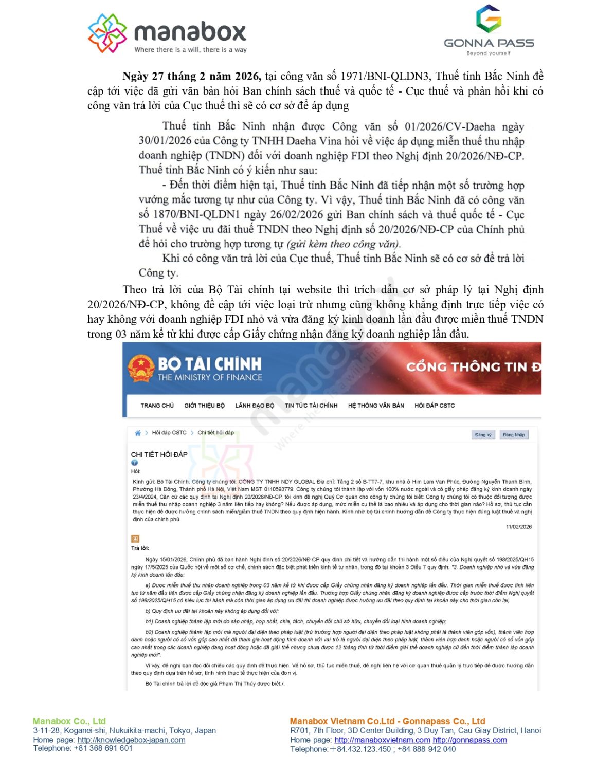 Cục Thuế tỉnh Bắc Ninh (Chờ hướng dẫn từ Tổng cục Thuế): Tại Công văn số 1971/BNI-QLDN3 ban hành ngày 27/02/2026, Cục Thuế tỉnh Bắc Ninh cho biết đã tiếp nhận một số vướng mắc tương tự và đã gửi Công văn số 1870/BNI-QLDN1 (ngày 26/02/2026) lên Ban Chính sách và Thuế quốc tế – Tổng cục Thuế để xin ý kiến chỉ đạo. Cơ quan này sẽ chỉ có cơ sở trả lời doanh nghiệp khi có phản hồi chính thức từ Tổng cục Thuế.