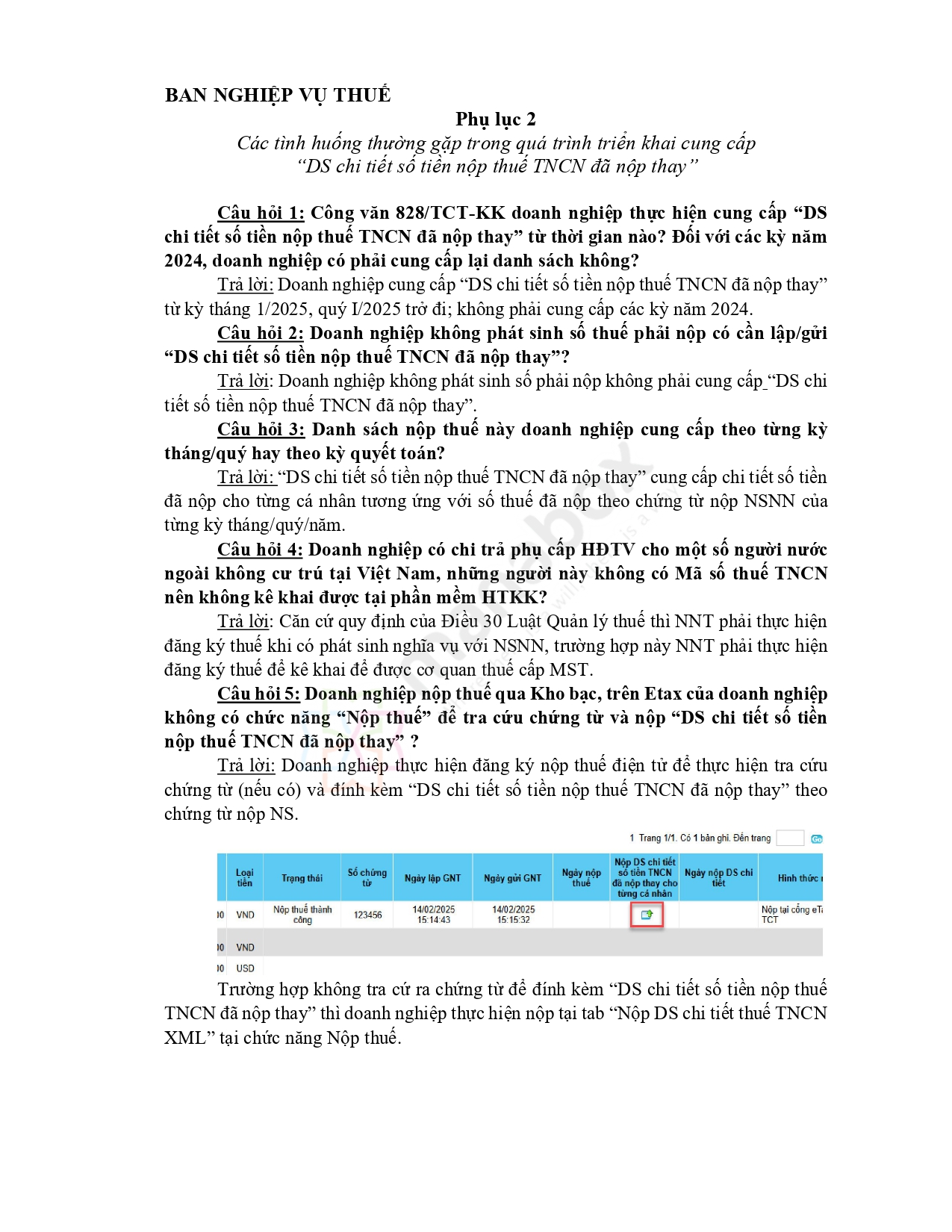 Câu hỏi 1: Công văn 828/TCT-KK doanh nghiệp thực hiện cung cấp “DS chi tiết số tiền nộp thuế TNCN đã nộp thay” từ thời gian nào? Đối với các kỳ năm 2024, doanh nghiệp có phải cung cấp lại danh sách không?
