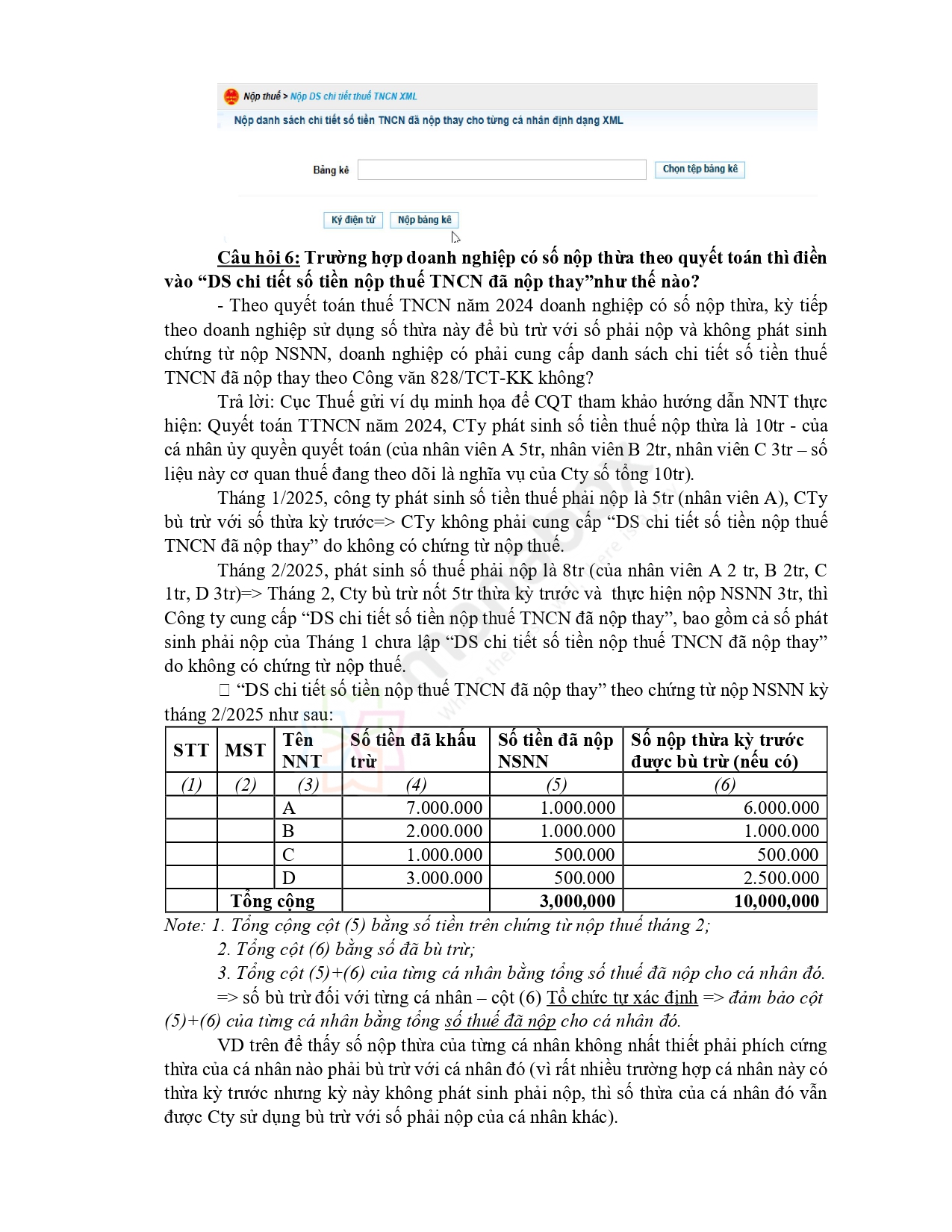 Câu hỏi 6: Trường hợp doanh nghiệp có số nộp thừa theo quyết toán thì điền vào “DS chi tiết số tiền nộp thuế TNCN đã nộp thay”như thế nào?