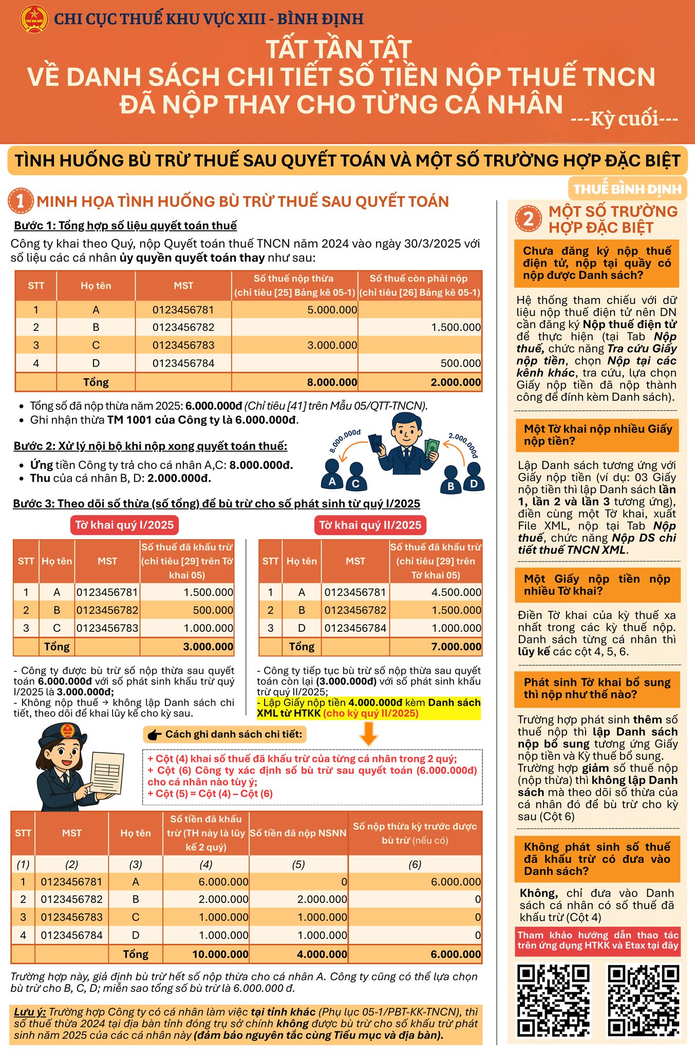 Tháng 2/2025, phát sinh số thuế phải nộp là 8tr (của nhân viên A 2 tr, B 2tr, C 1tr, D 3tr)=> Tháng 2, Cty bù trừ nốt 5tr thừa kỳ trước và thực hiện nộp NSNN 3tr, thì Công ty cung cấp “DS chi tiết số tiền nộp thuế TNCN đã nộp thay”, bao gồm cả số phát sinh phải nộp của Tháng 1 chưa lập “DS chi tiết số tiền nộp thuế TNCN đã nộp thay” do không có chứng từ nộp thuế.