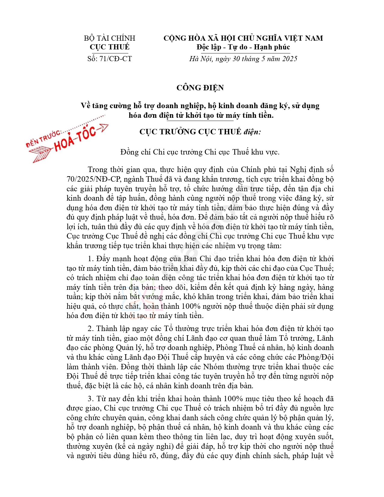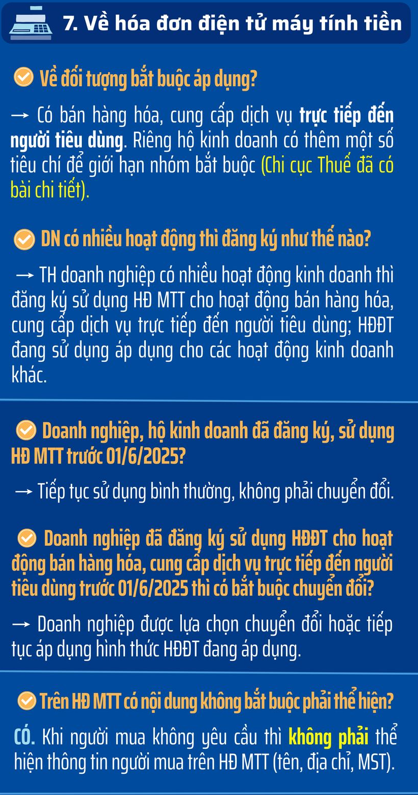 5. Trường hợp doanh nghiệp có hoạt động bán hàng hóa, cung cấp dịch vụ trực tiếp đến người tiêu dùng (trung tâm thương mại; siêu thị; bán lẻ (trừ ô tô, mô tô, xe máy và xe có động cơ khác); ăn uống; nhà hàng; khách sạn; dịch vụ vận tải hành khách, dịch vụ hỗ trợ trực tiếp cho vận tải đường bộ, dịch vụ nghệ thuật, vui chơi, giải trí, hoạt động chiếu phim, dịch vụ phục vụ cá nhân khác theo quy định về Hệ thống ngành kinh tế Việt Nam) đã đăng ký sử dụng hóa đơn điện tử có mã, hóa đơn điện tử không có mã của cơ quan thuế phục vụ hoạt động bán hàng hóa, cung cấp dịch vụ trực tiếp đến người tiêu dùng nêu trên trước ngày 01/6/2025 thì được lựa chọn hoặc chuyển đổi áp dụng hóa đơn điện tử khởi tạo từ máy tính tiền theo quy định tại Nghị định số 70/2025/NĐ-CP hoặc tiếp tục sử dụng hóa đơn điện tử đã đăng ký sử dụng với cơ quan thuế.