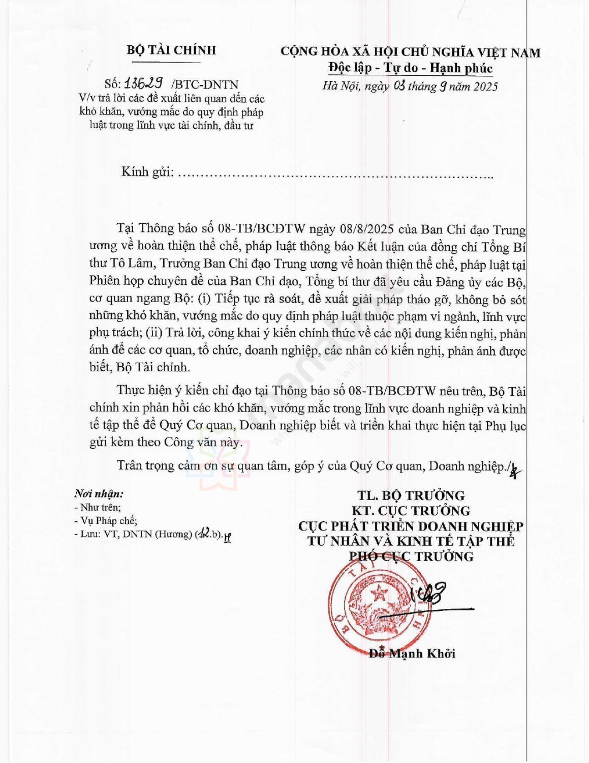 Giải đáp vướng mắc Luật doanh nghiệp, Luật đầu tư… tại công văn số 13629/BTC-DNTN V/v trả lòi các đề xuất liên quan đến các khó khăn, vướng mắc do quy định pháp luật trong lĩnh vực tài chính, đầu tư