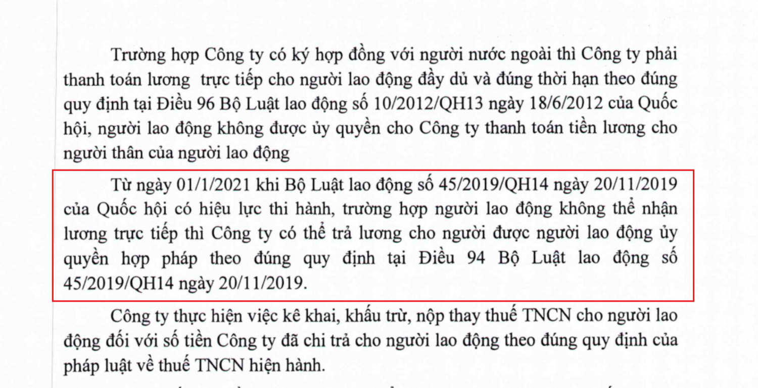 Theo hướng dẫn tại công văn của cơ quan thuế, từ 1/1/2021, Bộ Luật Lao động 45/2019/QH14 có nội dung công ty có thể trả lương cho người được người lao động ủy quyền hợp pháp