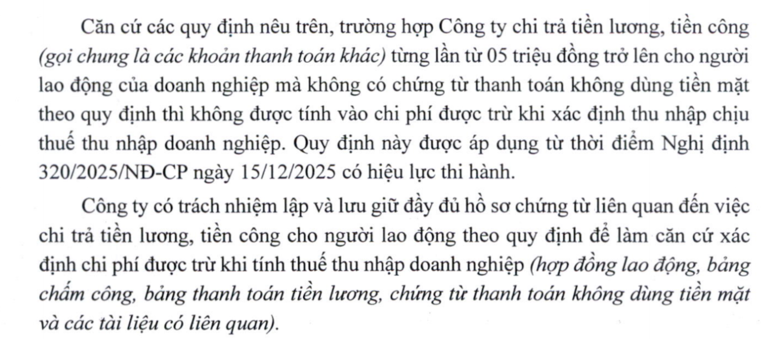Từ 15/12/2025, khi DN trả tiền lương 5 triệu trở lên mà không có chứng từ thanh toán không dùng tiền mặt, cơ quan thuế có cơ sở loại khoản chi này khỏi chi phí được trừ khi tính TNDN Theo hướng dẫn của Cục Thuế Thái Nguyên, DN nên lưu đầy đủ bộ hồ sơ lương: HĐLĐ, chấm công/đánh giá sản lượng, bảng tính & thanh toán lương, và chứng từ thanh toán không dùng tiền mặt kèm tài liệu liên quan.