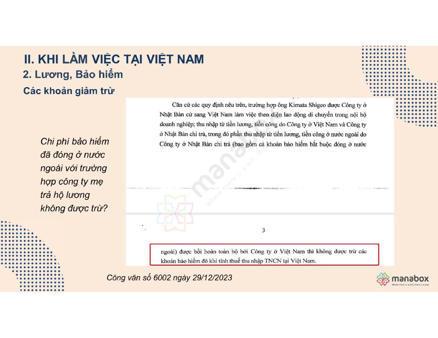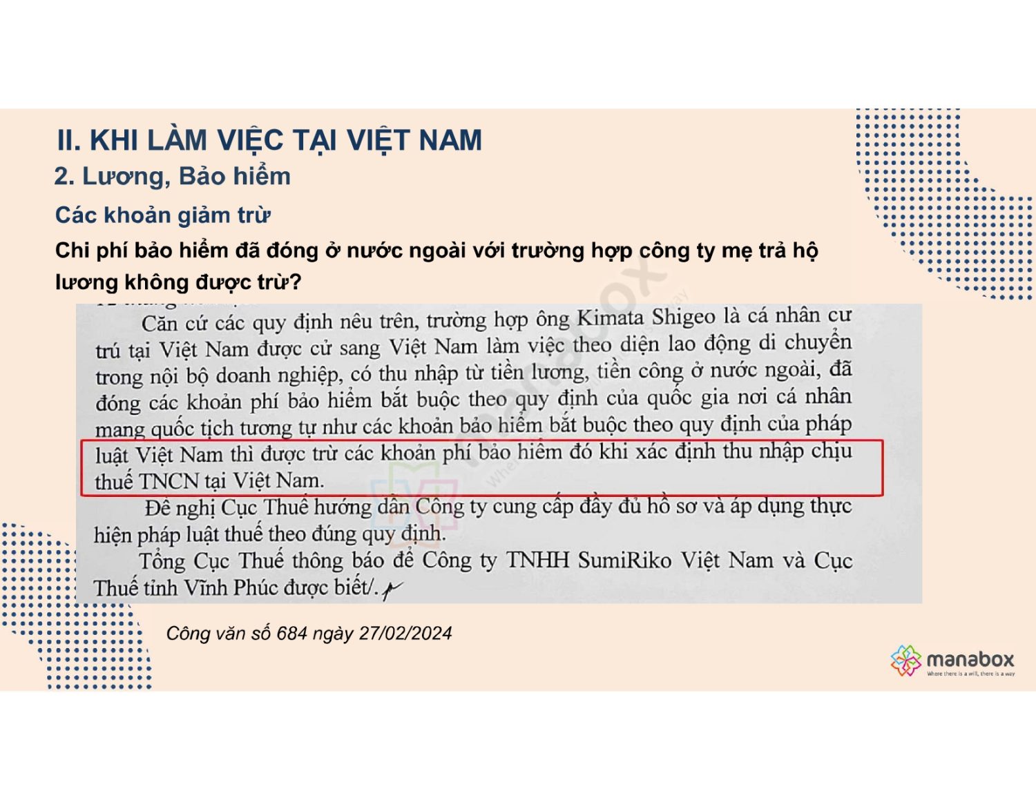 Căn cứ các quy định nêu trên, trường hợp ông Kimata Shigeo được Công ty ở Nhật Bản cử sang Việt Nam làm việc theo diện lao động di chuyển trong nội bộ doanh nghiệp; thu nhập từ tiền lương, tiền công do Công ty ở Việt Nam và Công ty ở Nhật Bản chi trả, trong đó phần thu nhập từ tiền lương, tiền công ở nước ngoài do Công ty ở Nhật Bản chi trả (bao gồm cả khoản bảo hiểm bắt buộc đóng ở nước ngoài) được bồi hoàn toàn bộ bởi Công ty ở Việt Nam thì không được trừ các khoản bảo hiểm đó khi tính thuế thu nhập TNCN tại Việt Nam.