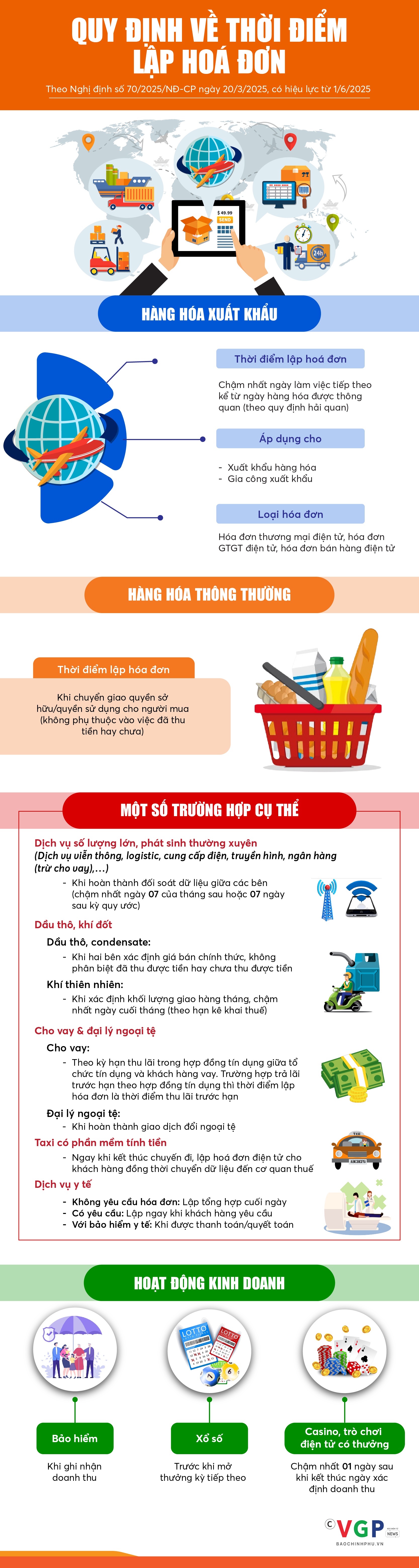 “a) Đối với các trường hợp bán hàng hóa, cung cấp dịch vụ với số lượng lớn, phát sinh thường xuyên, cần có thời gian đối soát số liệu giữa doanh nghiệp bán hàng hóa, cung cấp dịch vụ và khách hàng, đối tác gồm: Trường hợp cung cấp dịch vụ hỗ trợ trực tiếp cho vận tải hàng không, cung ứng nhiên liệu hàng không cho các hãng hàng không, hoạt động cung cấp điện (trừ đối tượng quy định tại điểm h khoản này), cung cấp dịch vụ hỗ trợ vận tải đường sắt, nước, dịch vụ truyền hình, dịch vụ quảng cáo truyền hình, dịch vụ thương mại điện tử, dịch vụ bưu chính và chuyển phát (bao gồm cả dịch vụ đại lý, dịch vụ thu hộ, chi hộ), dịch vụ viễn thông (bao gồm cả dịch vụ viễn thông giá trị gia tăng), dịch vụ logistic, dịch vụ công nghệ thông tin (trừ trường hợp quy định tại điểm b khoản này) được bán theo kỳ nhất định, dịch vụ ngân hàng (trừ hoạt động cho vay), chuyển tiền quốc tế, dịch vụ chứng khoán, xổ số điện toán, thu phí sử dụng đường bộ giữa nhà đầu tư và nhà cung cấp dịch vụ thu phí và các trường hợp khác theo hướng dẫn của Bộ trưởng Bộ Tài chính, thời điểm lập hóa đơn là thời điểm hoàn thành việc đối soát dữ liệu giữa các bên nhưng chậm nhất không quá ngày 07 của tháng sau tháng phát sinh việc cung cấp dịch vụ hoặc không quá 07 ngày kể từ ngày kết thúc kỳ quy ước. Kỳ quy ước để làm căn cứ tính lượng hàng hóa, dịch vụ cung cấp căn cứ thỏa thuận giữa đơn vị bán hàng hóa, cung cấp dịch vụ với người mua.”