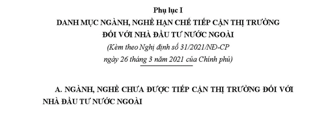 - Phạm vi hoạt động: Hoạt động đầu tư của nhà đầu tư nước ngoài được thực hiện trong phạm vi quy định trong các văn bản pháp luật ( Ví dụ: Phụ lục 01: Nghị định 31/2021/NĐ-CP)
