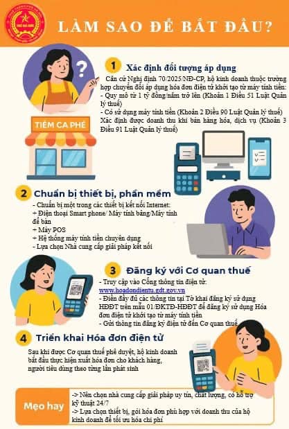 Theo quy định tại Nghị định 70/2025/NĐ-CP, kể từ ngày 01/6/2025, các Hộ kinh doanh nộp thuế khoán có doanh thu năm 2025 từ 1 tỷ đồng trở lên sẽ bắt buộc sử dụng hóa đơn điện tử có mã của cơ quan thuế, được khởi tạo từ máy tính tiền. Đây không còn là lựa chọn – mà là nghĩa vụ bắt buộc. dưới đây là 10 bước cần thực hiện trước thời điểm quan trọng này để đảm bảo Hộ không bị động khi chuyển đổi theo yêu cầu của cơ quan thuế: