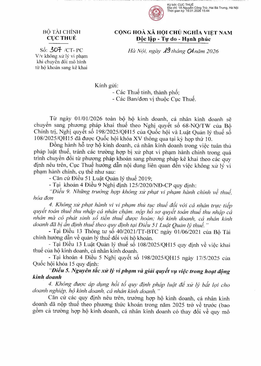 Công văn số 307/CT-PC ngày 19/01/2026 của Cục Thuế về việc không xử lý vi phạm khi chuyển đổi mô hình từ hộ khoán sang kê khai. Theo công văn 307/CT-PC, về việc không thanh tra, kiểm tra thuế đối với dữ liệu cũ: “Trường hợp hộ kinh doanh, cá nhân kinh doanh đã nộp thuế theo phương pháp khoán trong năm 2025 trở về trước… thì khi chuyển sang hình thức kê khai thuế từ ngày 01/01/2026 cơ quan thuế không thực hiện kiểm tra thuế, không sử dụng doanh thu khai thuế của hộ kinh doanh, cá nhân kinh doanh năm 2026 để xử lý hồi tố đối với nghĩa vụ thuế của hộ kinh doanh, cá nhân kinh doanh đã nộp thuế theo phương pháp khoán từ năm 2025 trở về trước…”