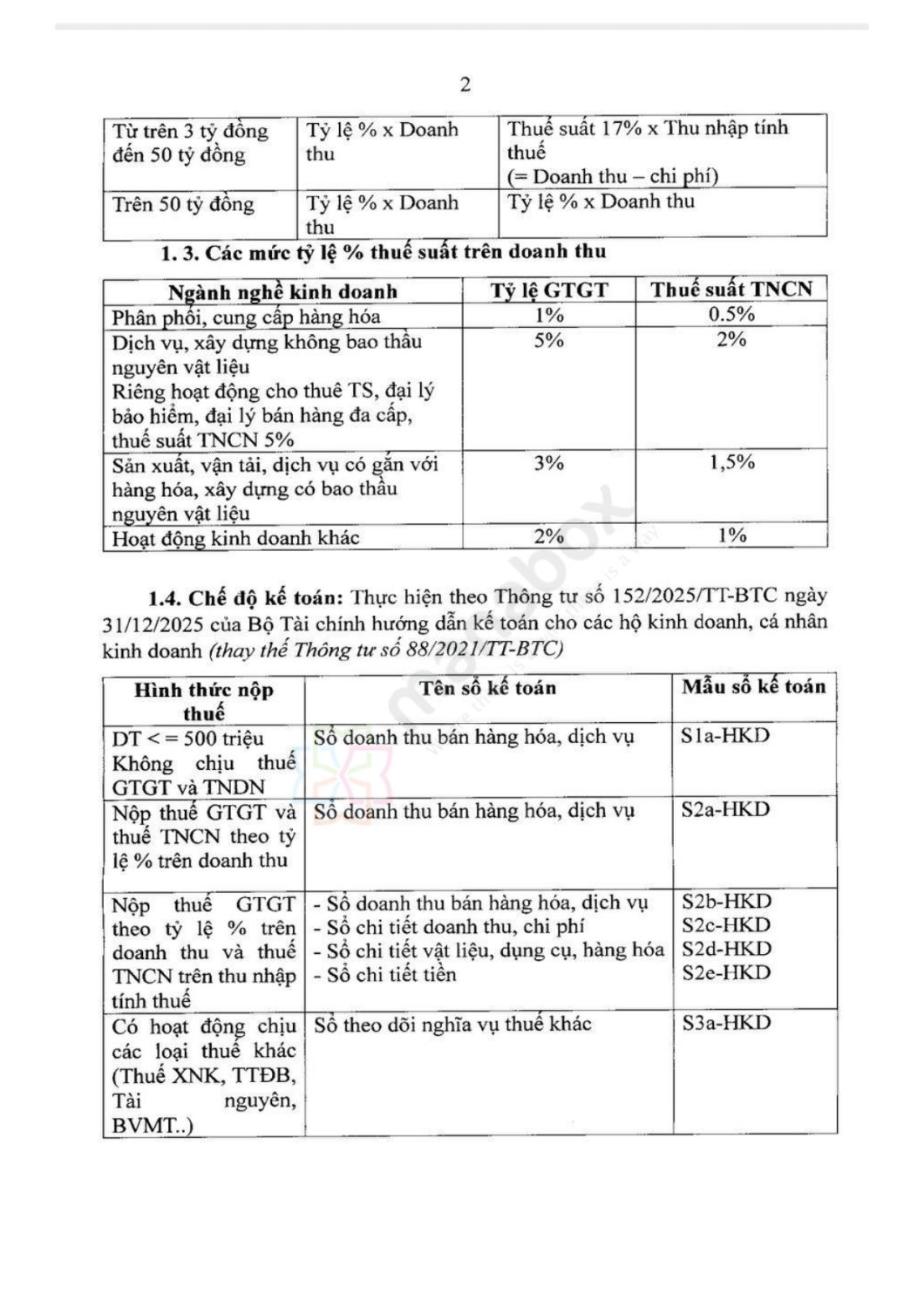1.4. Chế độ kế toán: Thực hiện theo Thông tư số 152/2025/TT-BTC ngày 31/12/2025 của Bộ Tài chính hướng dẫn kế toán cho các hộ kinh doanh, cá nhân kinh doanh (thay thế Thông tư số 88/2021/TT-BTC).