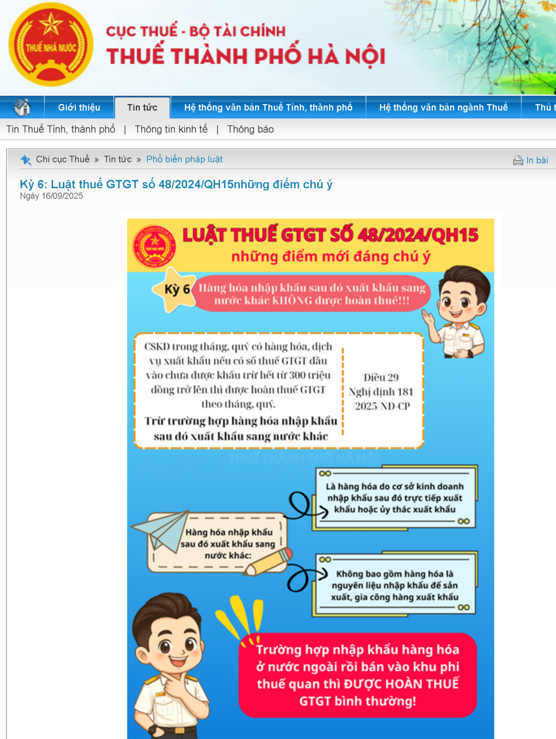Theo Luật Thuế GTGT số 48/2024/QH15 (có hiệu lực từ 01/07/2025) và Nghị định 181/2025/NĐ-CP, doanh nghiệp có hàng hóa, dịch vụ xuất khẩu (nếu thuế GTGT đầu vào chưa được khấu trừ hết từ 300 triệu đồng trở lên) thì được hoàn thuế GTGT theo tháng/quý. Tuy nhiên, luật mới có điểm cần chú ý: Hàng hóa nhập khẩu sau đó xuất khẩu sang nước khác thì không được hoàn thuế GTGT, trừ một số trường hợp ngoại lệ. Theo Cục thuế TP Hà Nội