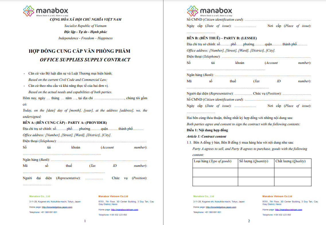Vật phẩm, thiết bị văn phòng là một trong những yếu tố không thể thiếu đối với các doanh nghiệp có văn phòng. Để hỗ trợ doanh nghiệp trong nước và doanh nghiệp nước ngoài về vấn đề mua bán văn phòng phẩm. Sau đây Manabox xin cung cấp thông tin về hợp đồng cung cấp văn phòng phẩm như sau: