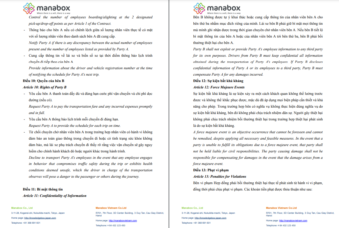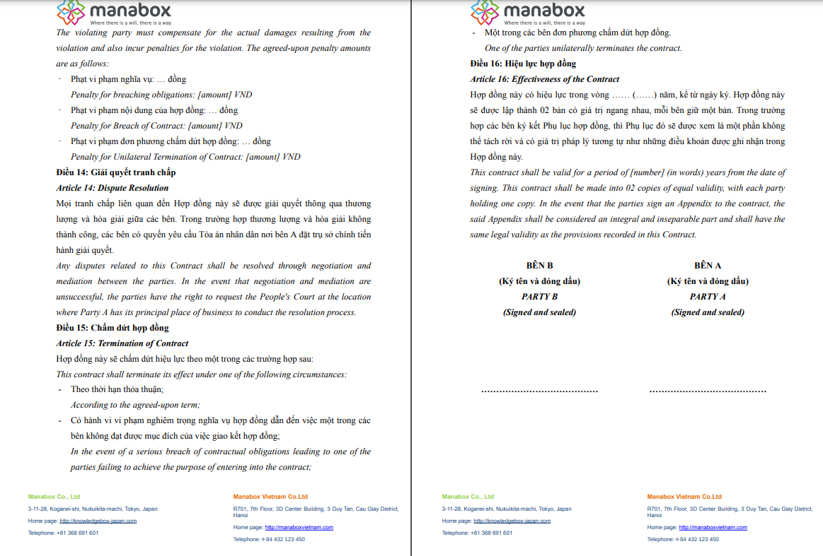 Bên cạnh đó mẫu hợp đồng được tích hợp hai ngôn ngữ Anh-Việt giúp doanh nghiệp nước ngoài dễ dàng tiếp cận với các dịch vụ trong nước đồng thời giảm thiểu rào cản ngôn ngữ giữa hai bên và tránh được rủi ro pháp lí.