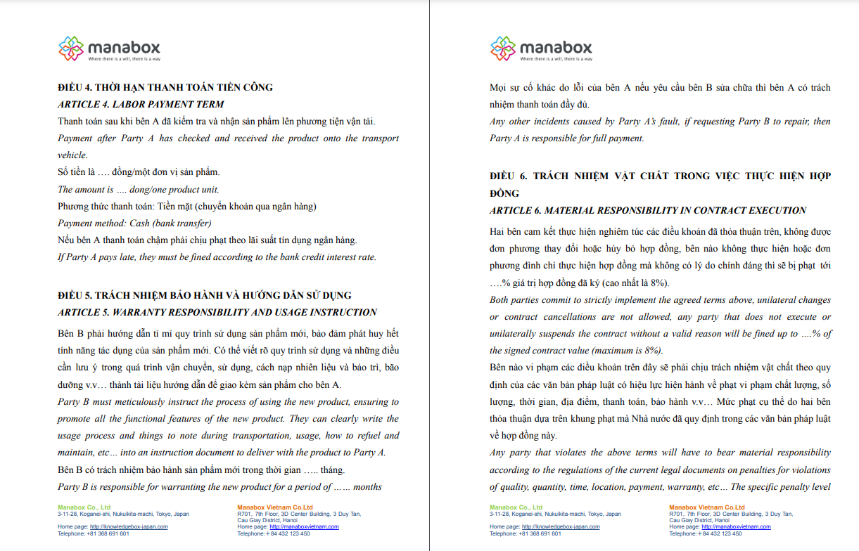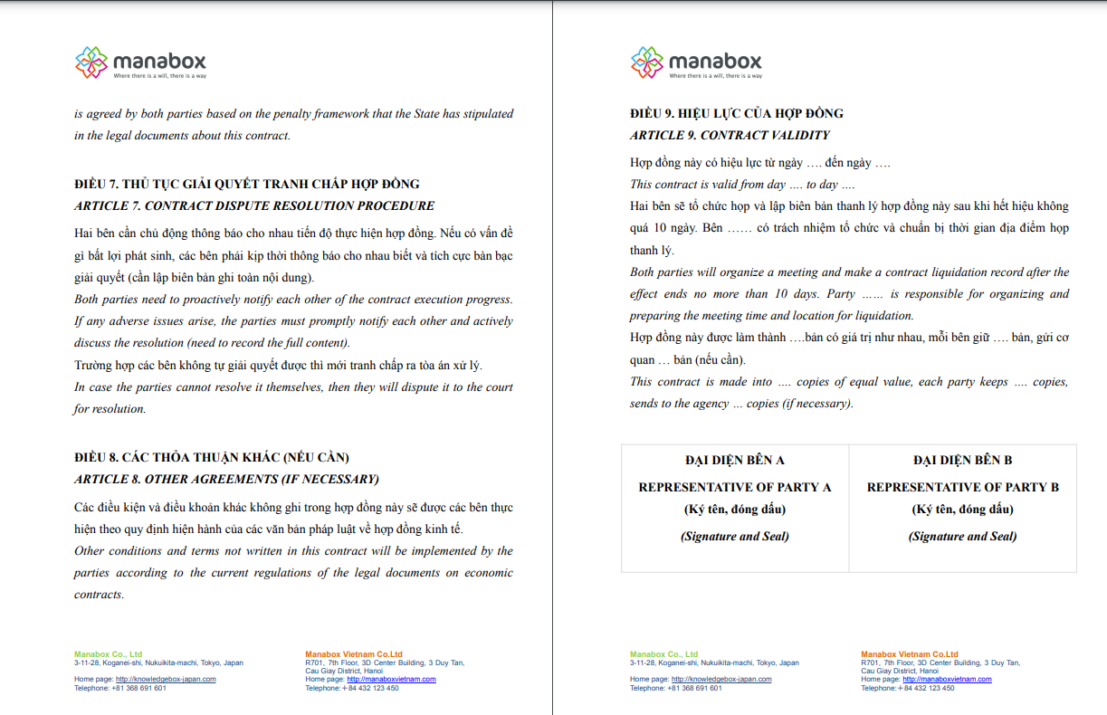 Bên cạnh đó mẫu hợp đồng được tích hợp hai ngôn ngữ Anh-Việt giúp doanh nghiệp nước ngoài dễ dàng tiếp cận với các dịch vụ trong nước đồng thời giảm thiểu rào cản ngôn ngữ giữa hai bên và tránh được rủi ro pháp lí.