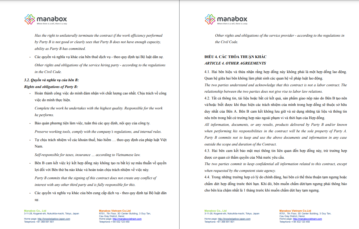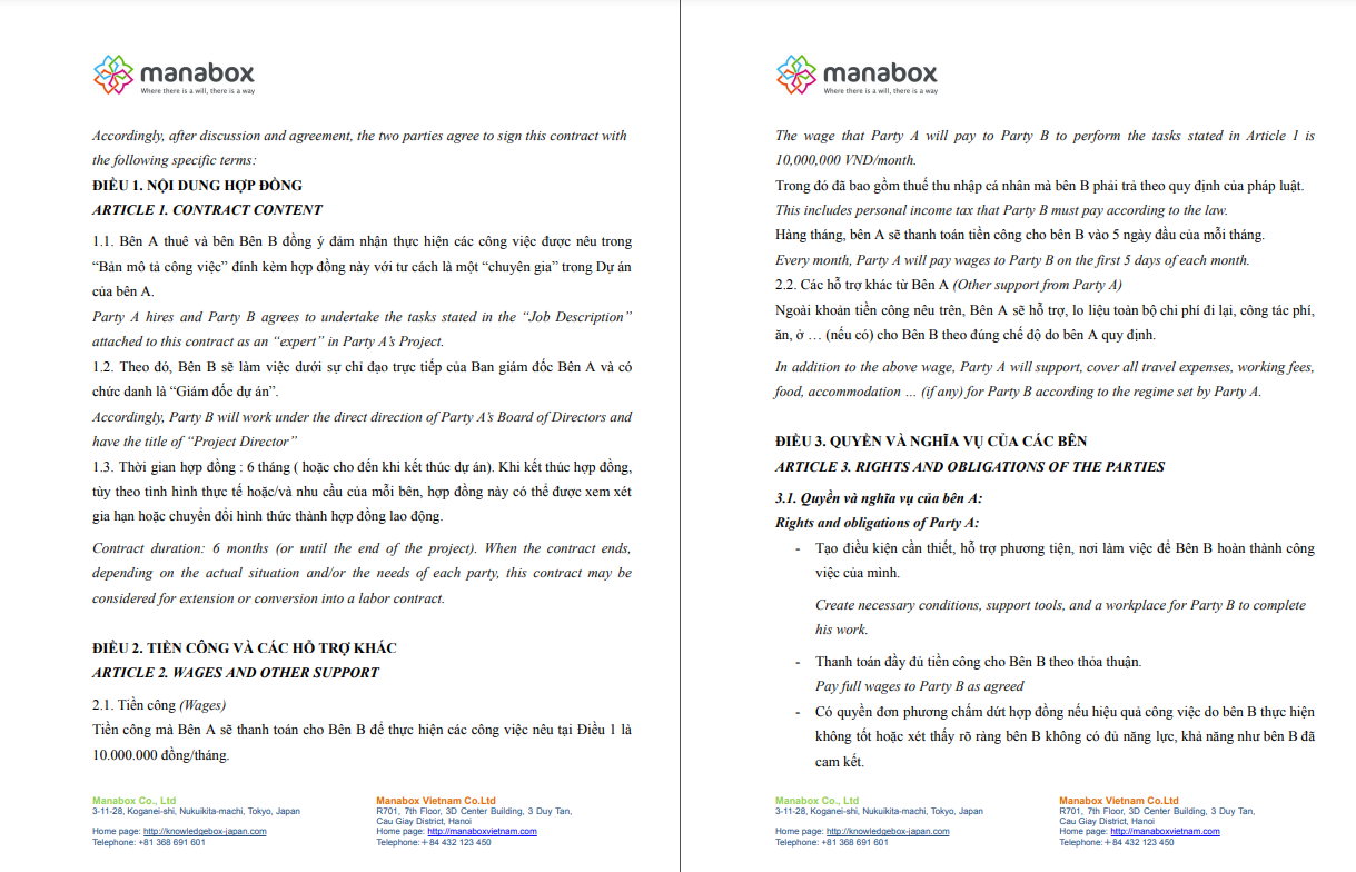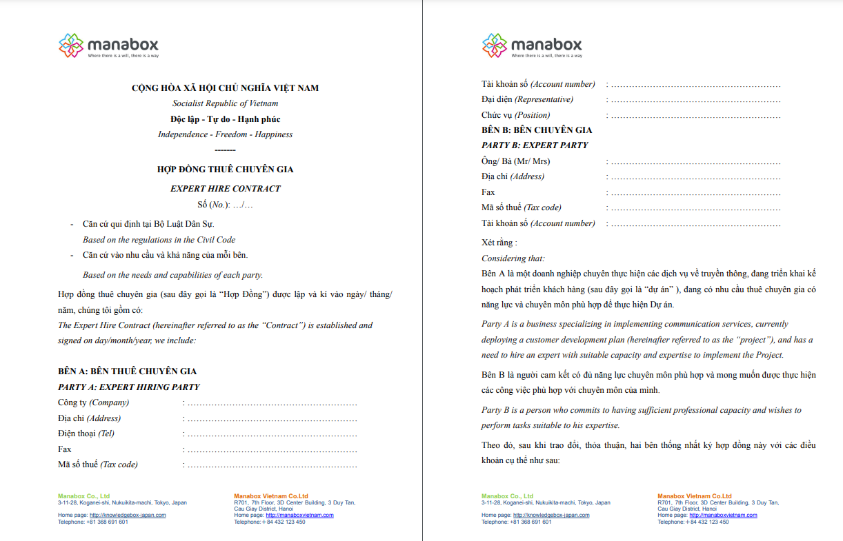 Hợp đồng thuê chuyên gia đóng một vai trò quan trọng trong nhiều lĩnh vực, từ kinh doanh đến chính phủ và giáo dục. Đồng thời, hợp đồng thuê chuyên gia giúp nâng cao năng lực và hiệu suất của tổ chức thông qua truy cập vào kiến thức chuyên môn, giải quyết vấn đề phức tạp, cung cấp góc nhìn mới và phát triển nhân viên. Sau đây, Manabox xin cung cấp đến quý độc giả những thông tin quan trọng về bản hợp đồng này