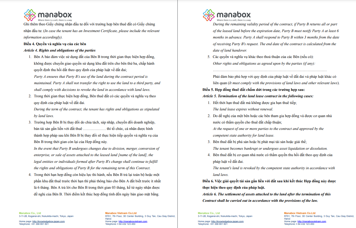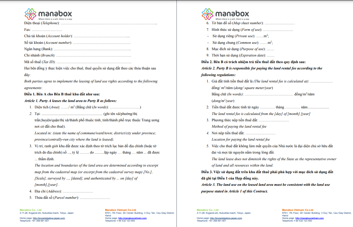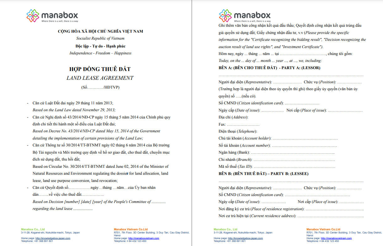 Ngày nay, việc thuê đất để canh tác, trồng trọt hay làm nhà xưởng để sản xuất, kinh doanh… là giao dịch rất phổ biến. Để hai bên tiến hành thuê và cho thuê đất tránh xảy ra tranh chấp sau này, cần thỏa thuận và ký kết hợp đồng thuê đất. Sau đây, Manabox xin cung cấp cho quý độc giả những thông tin về bản hợp đồng này.