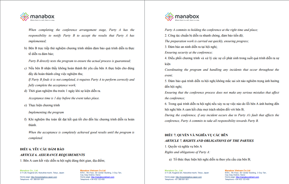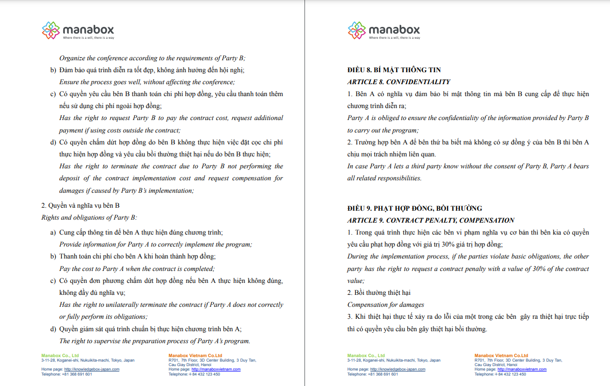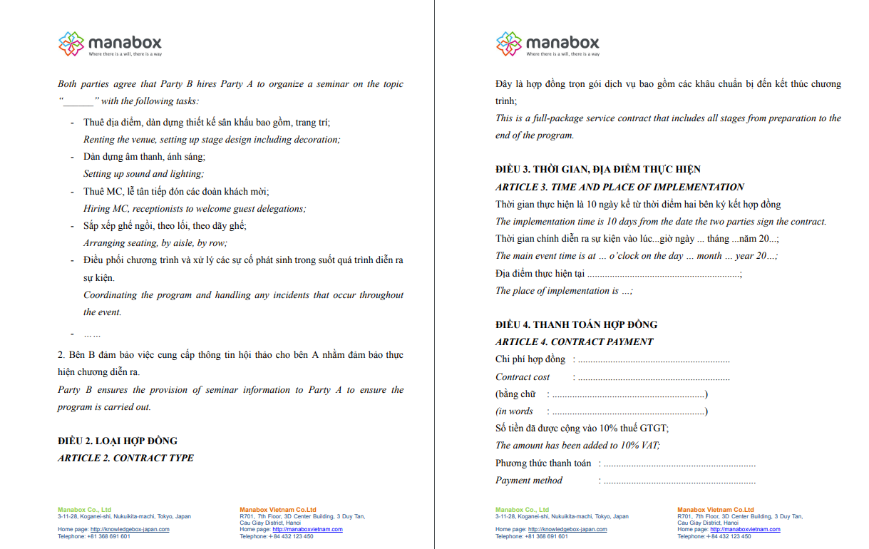 Bên cạnh đó mẫu hợp đồng được tích hợp hai ngôn ngữ Anh-Việt giúp doanh nghiệp nước ngoài dễ dàng tiếp cận với các dịch vụ trong nước đồng thời giảm thiểu rào cản ngôn ngữ giữa hai bên và tránh được rủi ro pháp lí.
