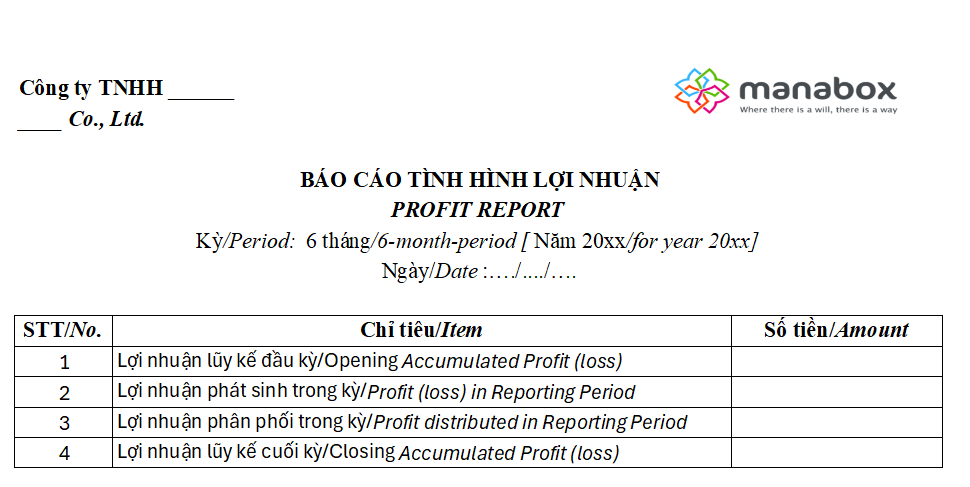 - Tình hình lợi nhuận (số thực hiện trong kỳ báo cáo, số lũy kế đến thời điểm báo cáo). Tham khảo mẫu của Manabox hoặc đơn vị báo cáo có thể thiết kế, lên phom mẫu báo cáo phù hợp với tình hình hoạt động của đơn vị