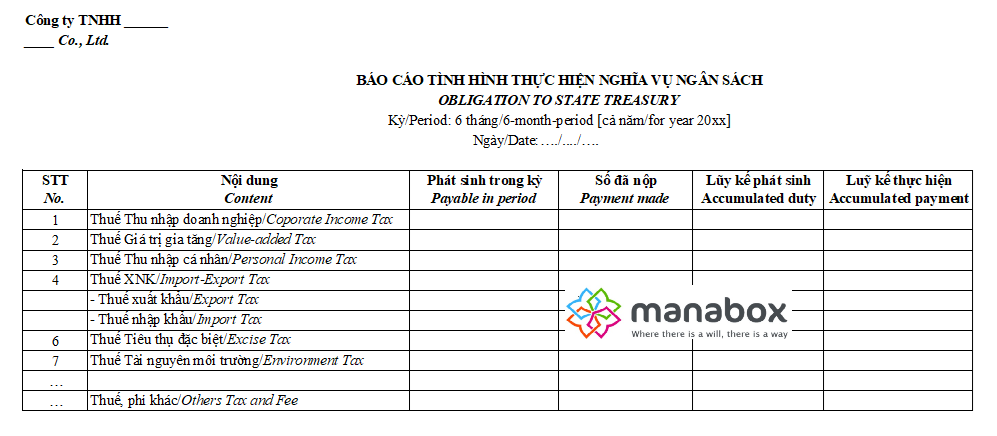 - Tình hình thực hiện nghĩa vụ với Ngân sách (số thực hiện trong kỳ báo cáo, số lũy kế đến thời điểm báo cáo, số còn phải nộp, nêu rõ nguyên nhân chưa nộp). Tham khảo mẫu của Manabox hoặc đơn vị báo cáo có thể thiết kế, lên phom mẫu báo cáo phù hợp với tình hình hoạt động của đơn vị: