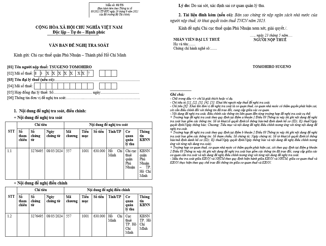 Khi đó, cá nhân có thể thực hiện gửi mẫu 01/TS theo TT 80/2021/TT-BTC đến cơ quan thuế để đề nghị điều chỉnh. Tại khoản 3 Điều 69 Thông tư 80/2021/TT-BTC, hồ sơ đề nghị tra soát thông tin thu, nộp ngân sách nhà nước bao gồm: