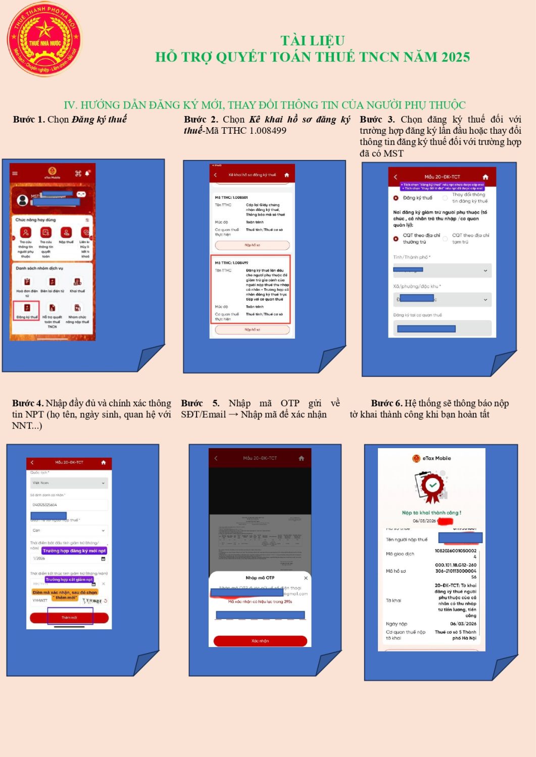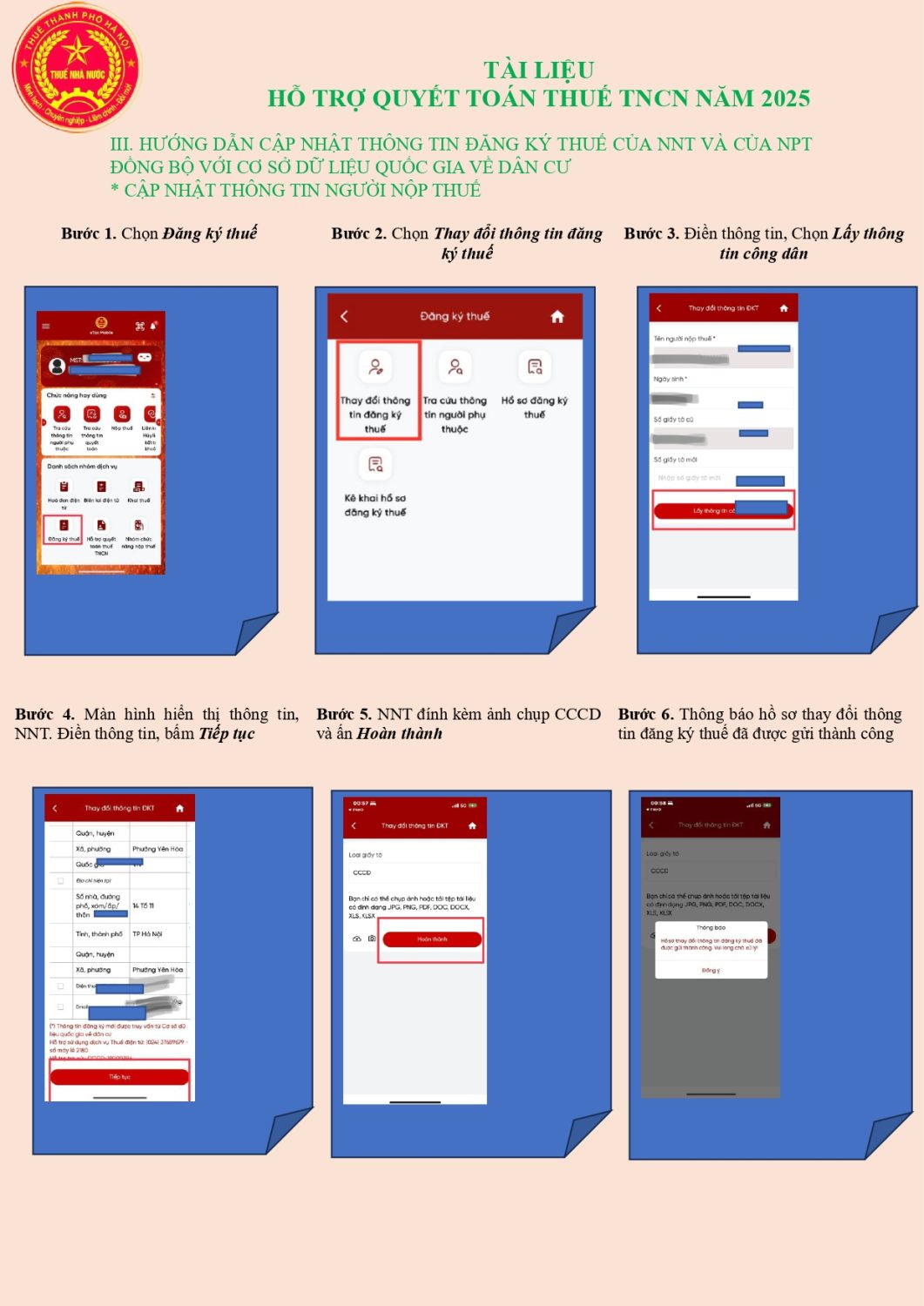 HƯỚNG DẪN CẬP NHẬT THÔNG TIN ĐĂNG KÝ THUẾ CỦA NNT VÀ CỦA NPT ĐỒNG BỘ VỚI CƠ SỞ DỮ LIỆU QUỐC GIA VỀ DÂN CƯ