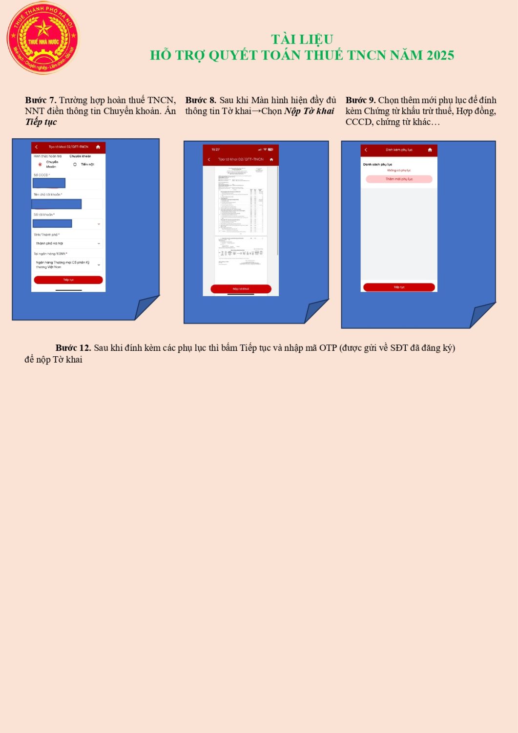 Trường hợp có người phụ thuộc thì kê khai vào Bảng kê 02-1/BK-QTT-TNCN. Nếu có số thuế được hoàn thì điền đầy đủ thông tin ngân hàng.