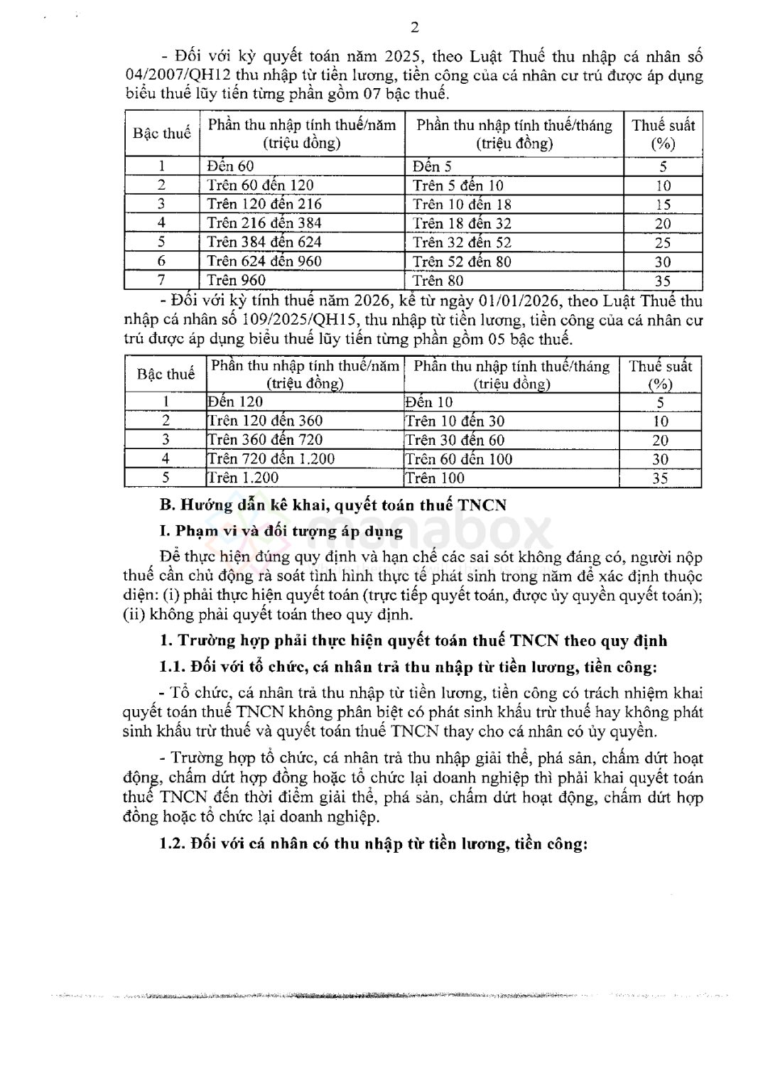 - – Đối với kỳ quyết toán năm 2025, theo Luật Thuế thu nhập cá nhân số 04/2007/QH12 thu nhập từ tiền lương, tiền công của cá nhân cư trú được áp dụng biểu thuế lũy tiến từng phần gồm 07 bậc thuế.