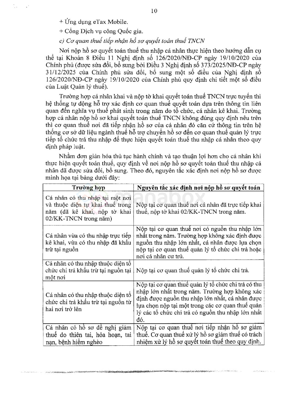 Nơi nộp hồ sơ quyết toán thuế thu nhập cá nhân thực hiện theo hướng dẫn cụ thể tại Khoản 8 Điều 11 Nghị định số 126/2020/NĐ-CP ngày 19/10/2020 của Chính phủ (được sửa đổi, bổ sung bởi Điều 3 Nghị định số 373/2025/NĐ-CP ngày 31/12/2025 của Chính phủ sửa đổi, bổ sung một số điều của Nghị định số 126/2020/NĐ-CP ngày 19/10/2020 của Chính phủ quy định chi tiết một số điều của Luật Quản lý thuế).