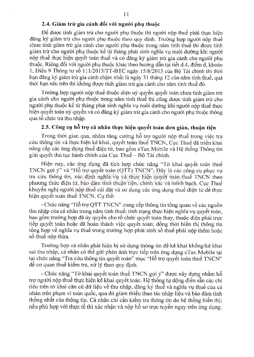 Trên đây là hướng dẫn của Cục Thuế về một số nội dung quyết toán thuế TNCN, áp dụng mức giảm trừ gia cảnh và biểu thuế lũy tiến mới theo quy định của pháp luật thuế TNCN, pháp luật quản lý thuế hiện hành. Trong quá trình triển khai nếu có vướng mắc, đề nghị các Thuế tỉnh, thành phố, Chi cục Thuế doanh nghiệp lớn, Chi cục Thuế thương mại điện tử phản ánh về Cục Thuế để có hướng dẫn xử lý kịp thời./.