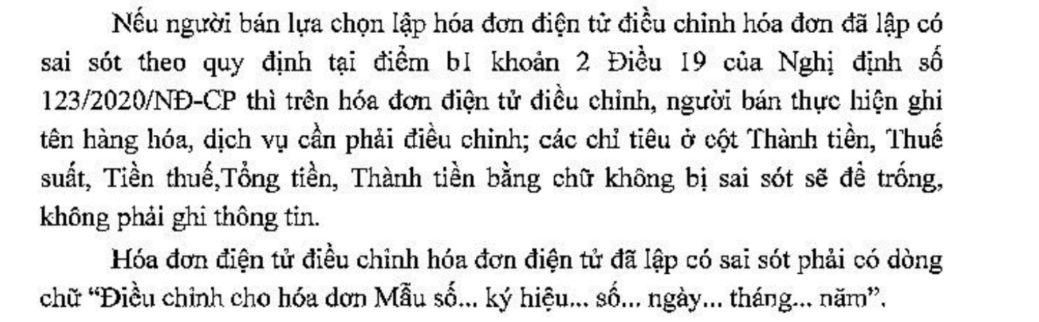 - Hóa đơn điều chỉnh phải ghi rõ nội dung điều chỉnh (giảm/tăng tiền hàng, số lượng, đơn giá, thuế suất, thành tiền…) và dẫn chiếu số hóa đơn gốc đã lập sai.
