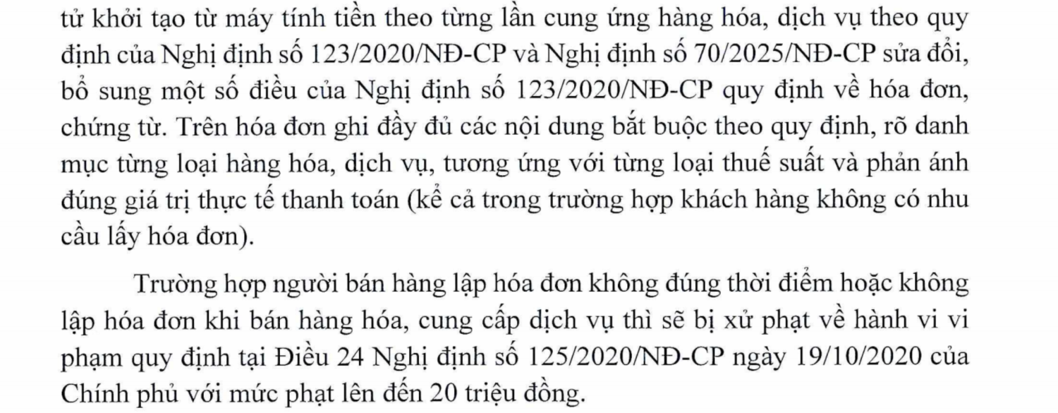 Trích Nghị định 70/2025/NĐ-CP “1. Khi bán hàng hóa, cung cấp dịch vụ, người bán phải lập hóa đơn để giao cho người mua (bao gồm cả các trường hợp hàng hóa, dịch vụ dùng để khuyến mại, quảng cáo, hàng mẫu; hàng hóa, dịch vụ dùng để cho, biếu, tặng, trao đổi, trả thay lương cho người lao động và tiêu dùng nội bộ (trừ hàng hóa luân chuyển nội bộ để tiếp tục quá trình sản xuất); xuất hàng hóa dưới các hình thức cho vay, cho mượn hoặc hoàn trả hàng hóa) và các trường hợp lập hóa đơn theo quy định tại Điều 19 Nghị định này. Hóa đơn phải ghi đầy đủ nội dung theo quy định tại Điều 10 Nghị định này. Trường hợp sử dụng hóa đơn điện tử phải theo định dạng chuẩn dữ liệu của cơ quan thuế theo quy định tại Điều 12 Nghị định này. Video Facebook: https://www.facebook.com/share/r/1C1Q3nqvbm/ |