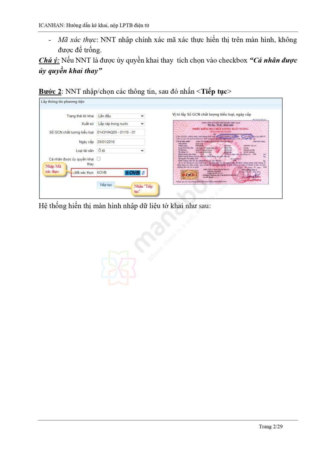Bước 3: Tại màn hình nộp hồ sơ, NNT nhập thông tin về Số giấy chứng nhận chất lượng an toàn kỹ thuật và bảo vệ môi trường (đối với xe nhập khẩu); Số seri Phiếu kiểm tra chất lượng xuất xưởng (đối với xe sản xuất lắp ráp trong nước) để Cổng Dịch vụ công của Cục Thuế tự động truy vấn sang cơ sở dữ liệu của Cục Đăng kiểm và hỗ trợ điền trước các thông tin về người nộp thuế, thông tin về tài sản tại tờ khai 02/LPTB.