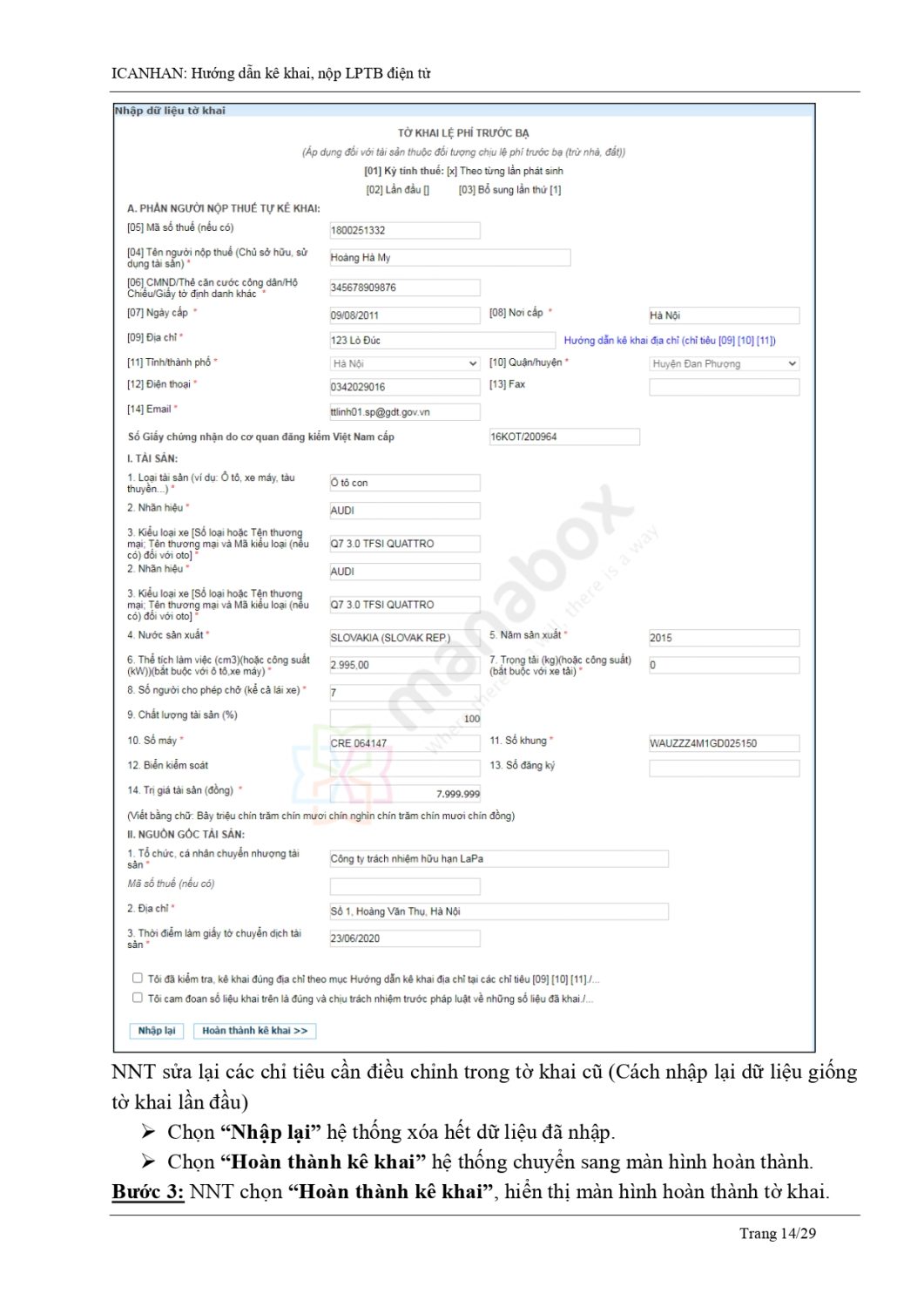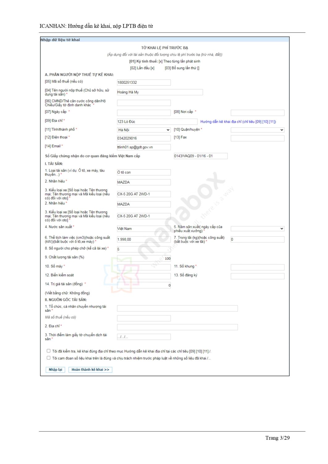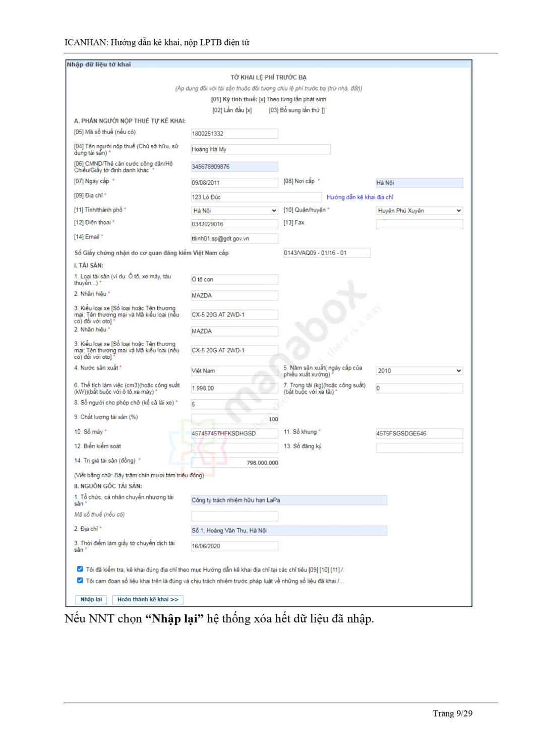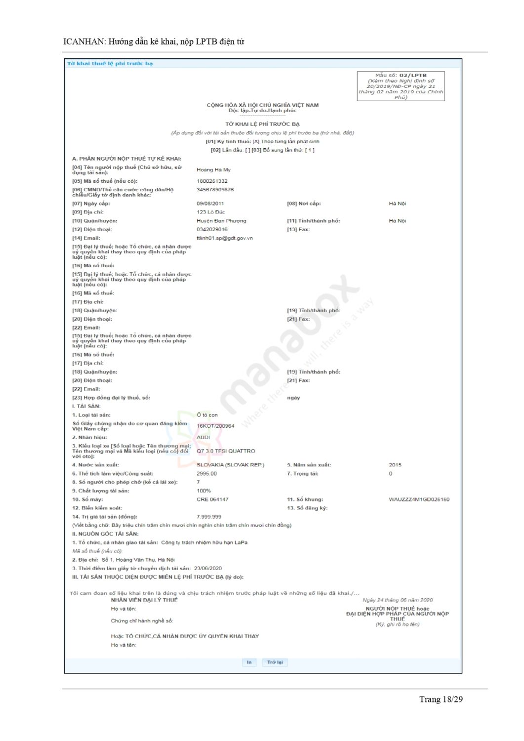 Bước 4: Người nộp thuế hoàn thiện các thông tin còn lại trên tờ khai 02/LPTB bao gồm: địa chỉ nơi sẽ đăng ký quyền sở hữu, sử dụng tài sản (địa chỉ thường trú hoặc tạm trú), thông tin hóa đơn điện tử (ký hiệu, mẫu số, số hóa đơn, ngày lập hóa đơn),… và xác nhận gửi hồ sơ khai.
