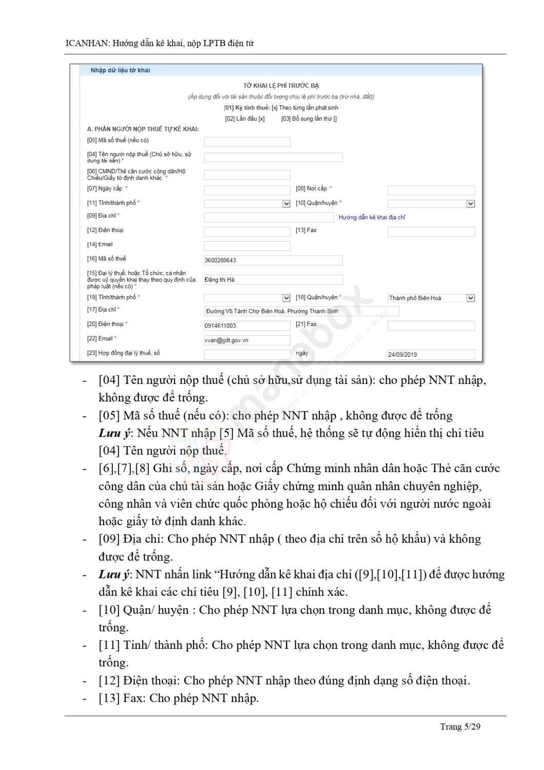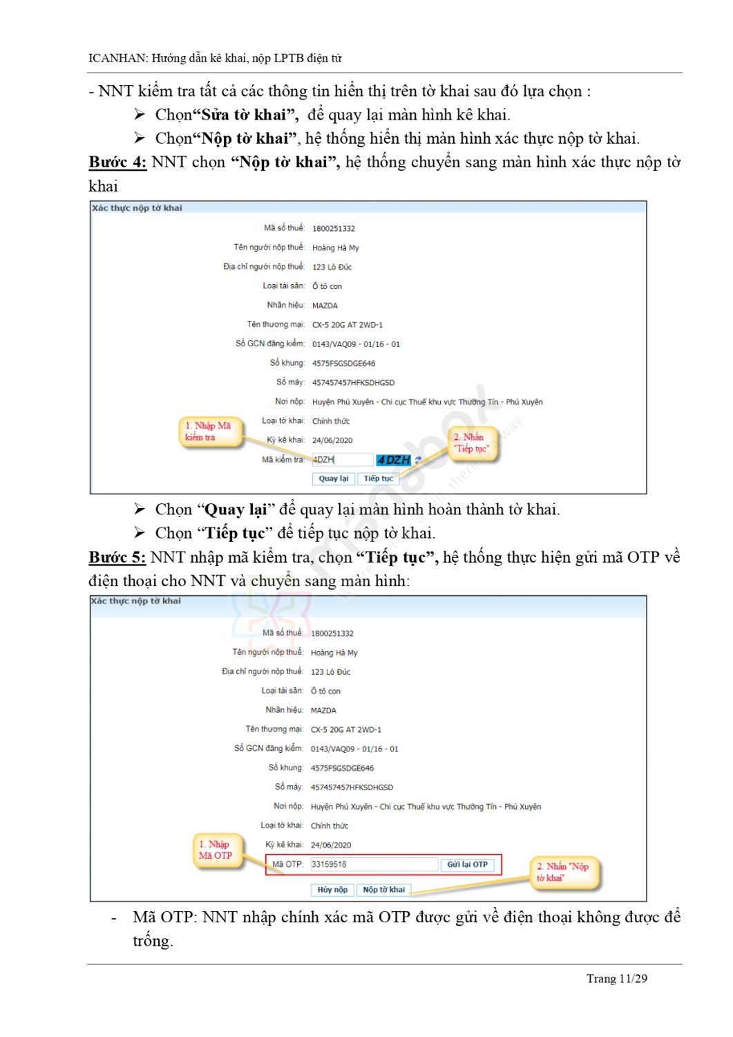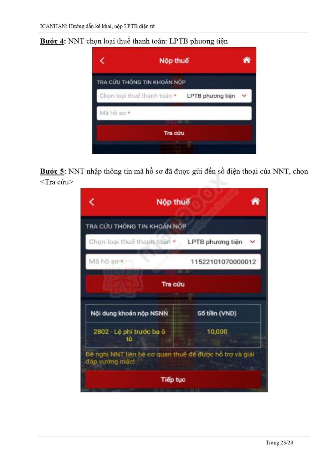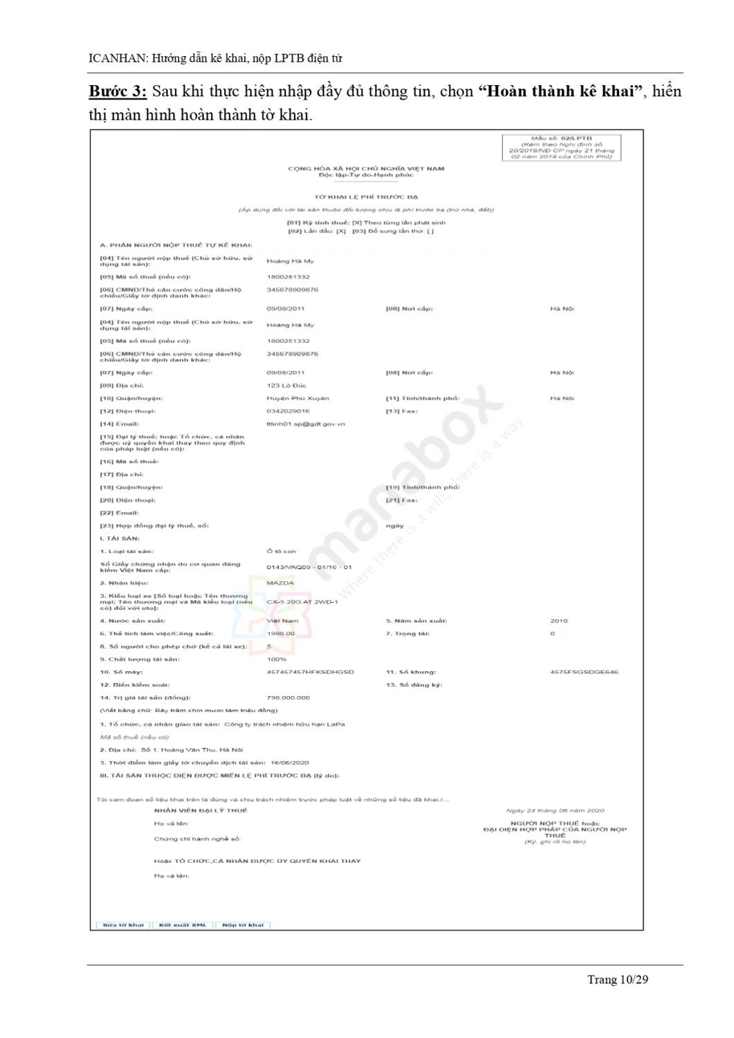 Bước 5: Cổng Dịch vụ công gửi thông báo chấp nhận hồ sơ khai thuế điện tử và Thông báo nộp LPTB vào địa chỉ thư điện tử của người nộp thuế, đồng thời gửi thông tin mã hồ sơ, số thuế LPTB phải nộp đến số điện thoại đã kê khai của người nộp thuế.