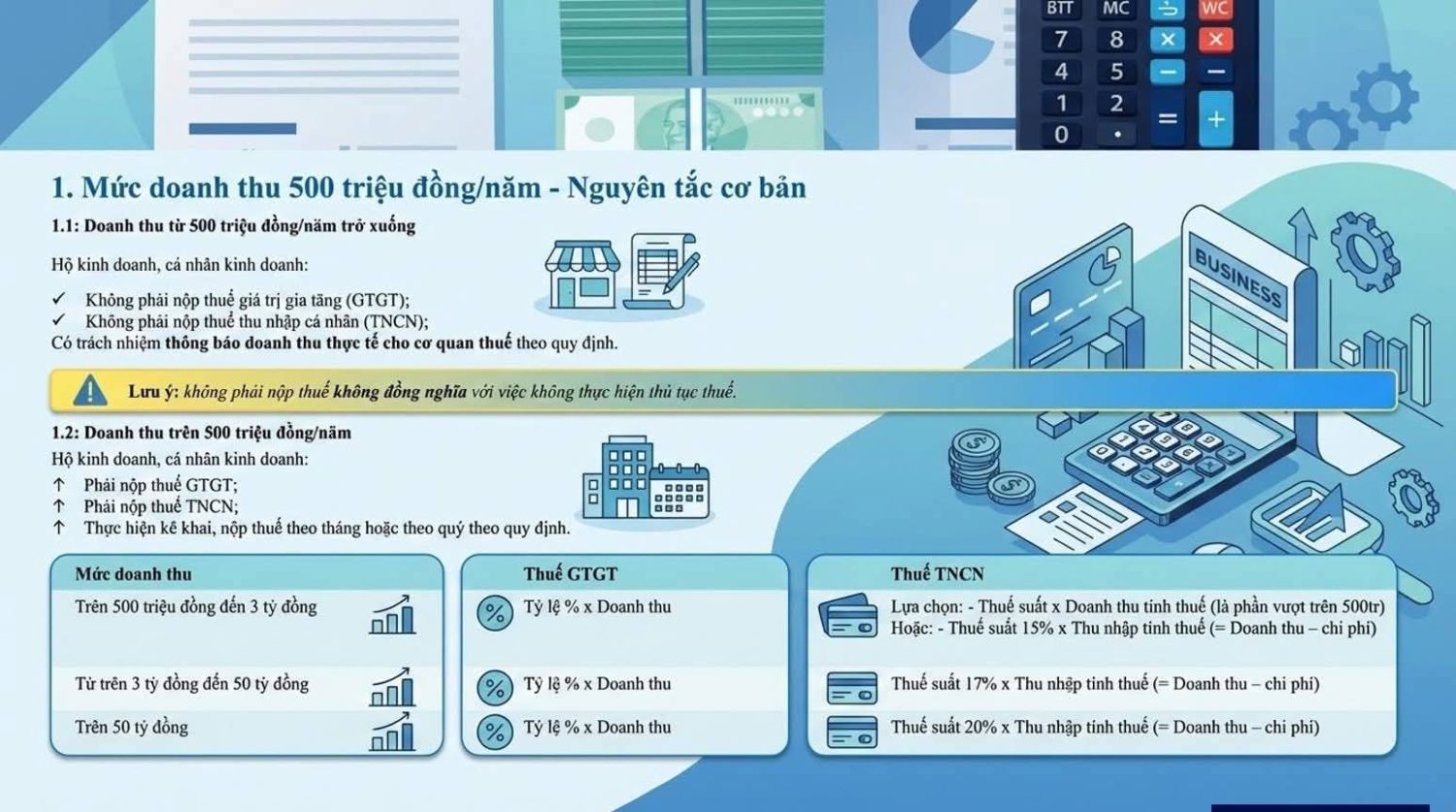 Hộ/Cá nhân kinh doanh không sử dụng hóa đơn trong nhóm doanh thu ≤ 500 triệu/năm. Ví dụ: Hộ kinh doanh cung cấp dịch vụ năm 2026 doanh thu có 450 triệu. Doanh thu ≤ 500 triệu ⇒ thuộc Nhóm 1 thì không bắt buộc sử dụng hóa đơn.