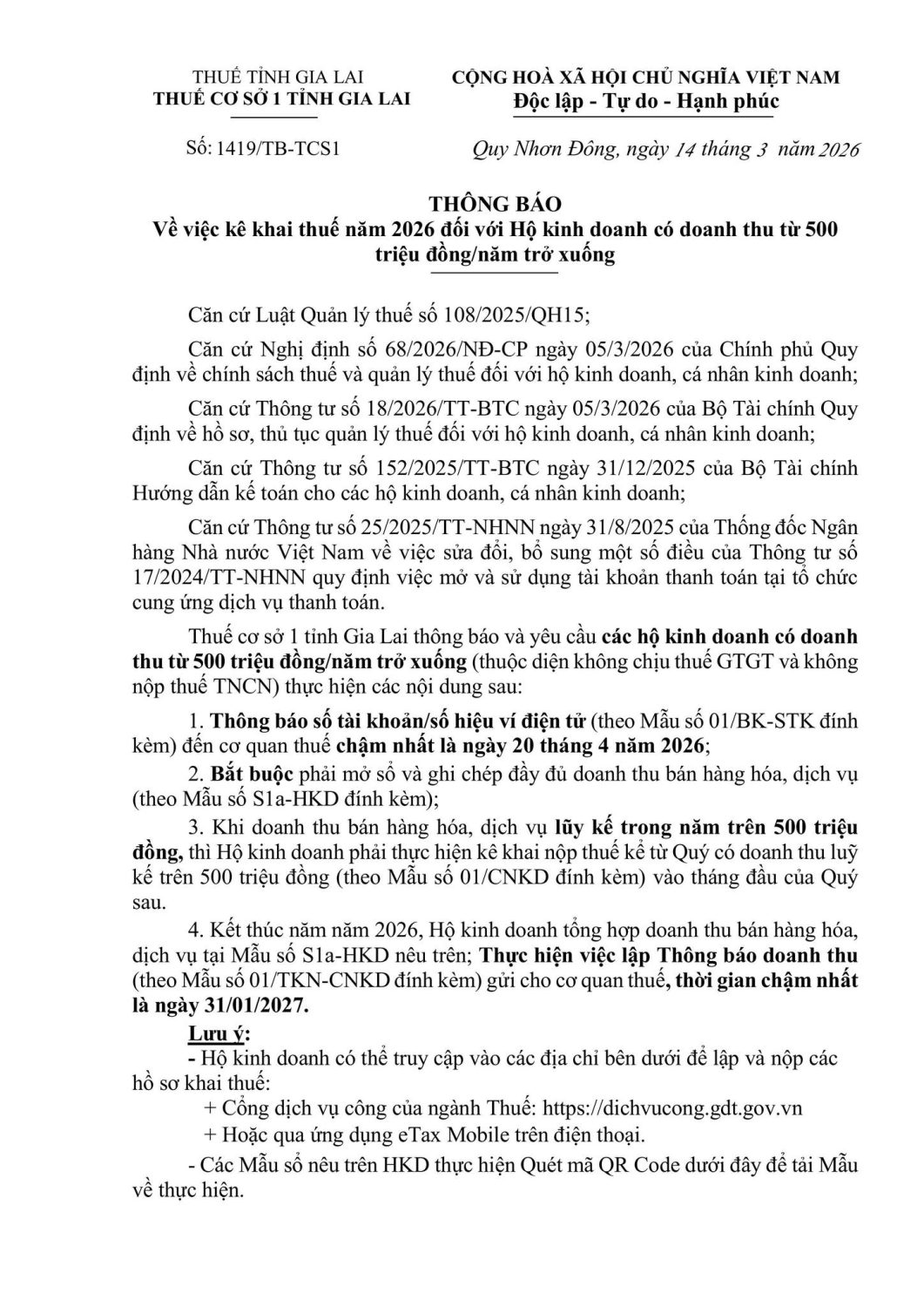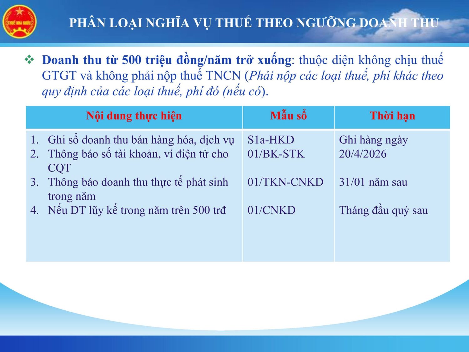 - – Có trách nhiệm thông báo doanh thu thực tế cho cơ quan thuế theo quy định. Lưu ý: Không phải nộp thuế không đồng nghĩa với việc không thực hiện thủ tục thuế. Mẫu sử dụng: 01/CNKD