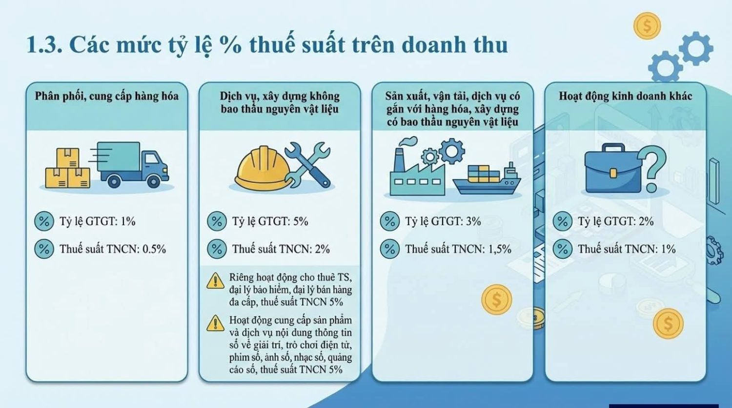 - Thuế GTGT: tính theo tỷ lệ % trên doanh thu (DT – 0) x tỷ lệ theo ngành nghề. Các mức tỷ lệ % thuế suất trên doanh thu