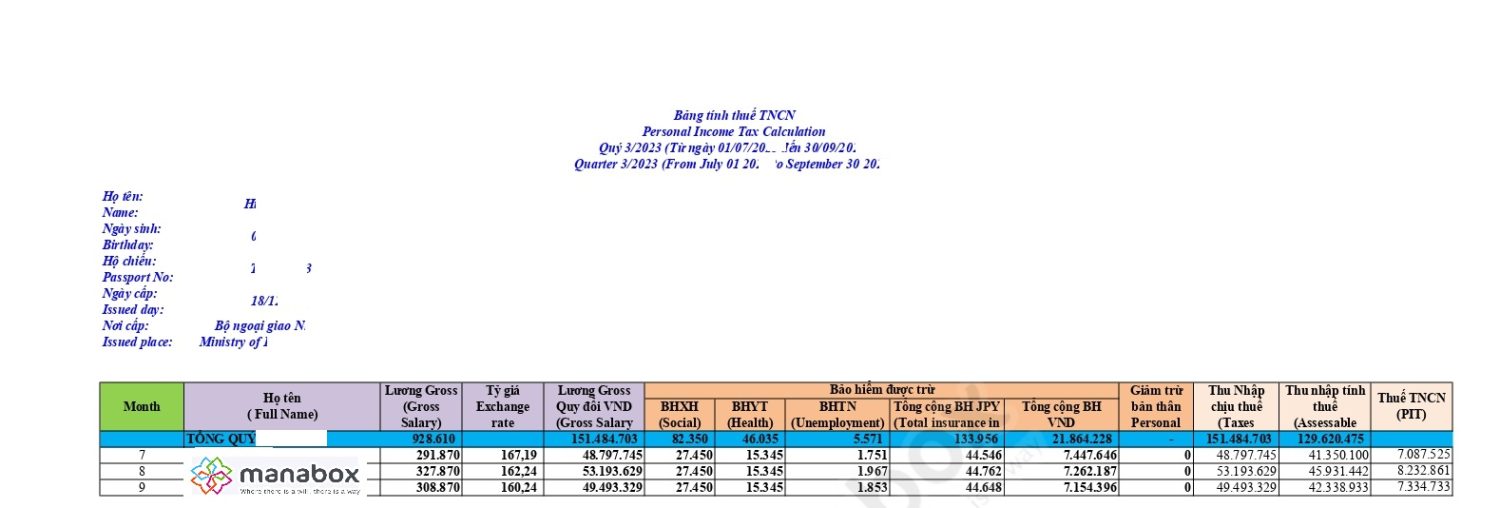- Lấy phiếu lương Nhật từng tháng ⇒ xác định gross, trợ cấp, bảo hiểm bắt buộc, thuế đã khấu trừ.