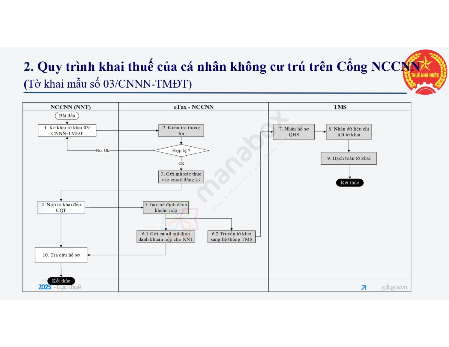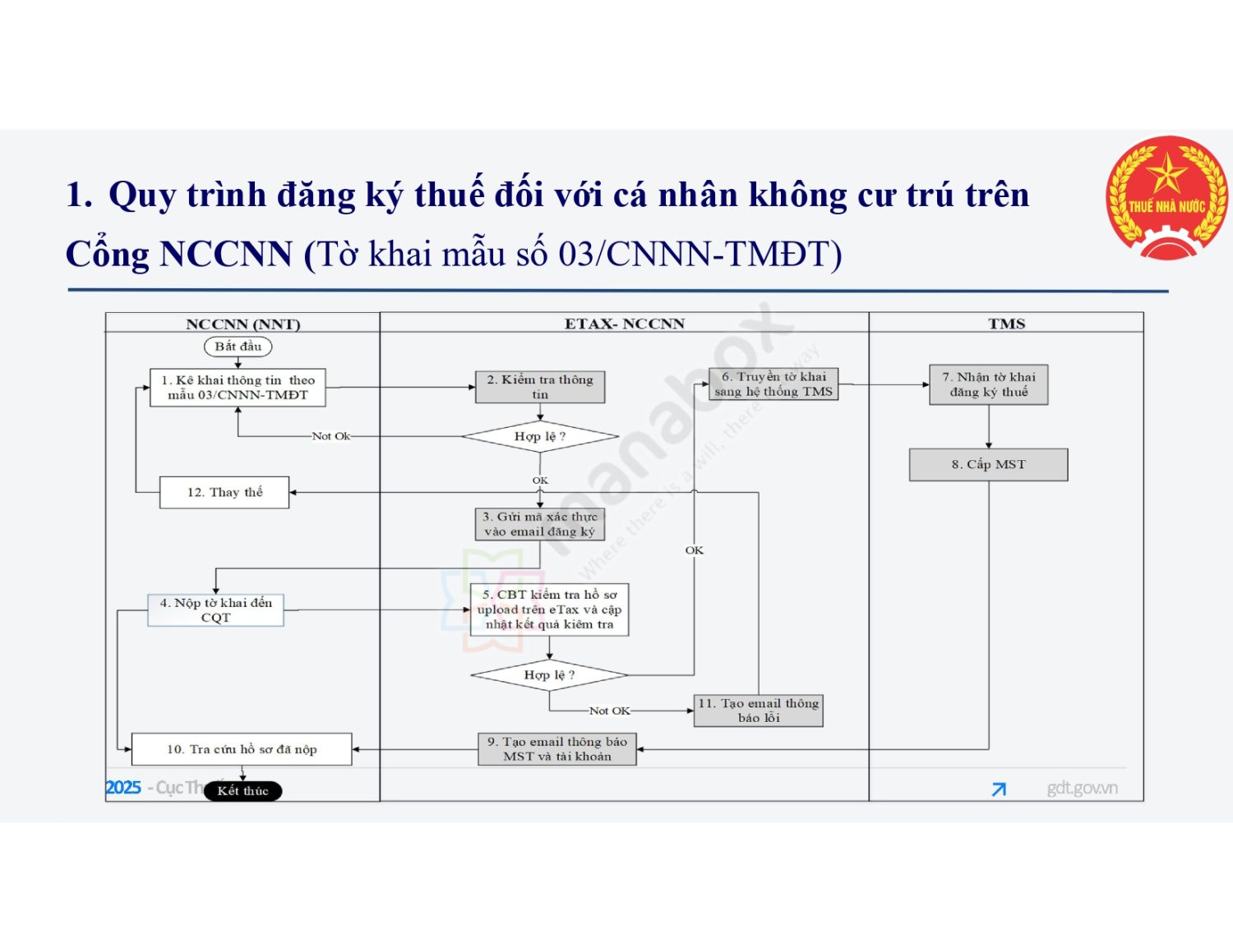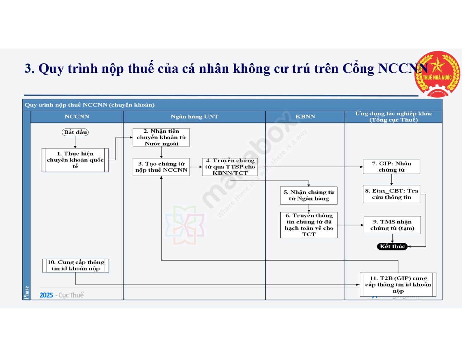 Nộp trực tuyến trên Cổng NCCNN theo hướng dẫn. 📌 Lưu ý: Cá nhân không cư trú có thể ủy quyền cho đại lý thuế tại Việt Nam để thực hiện thay.