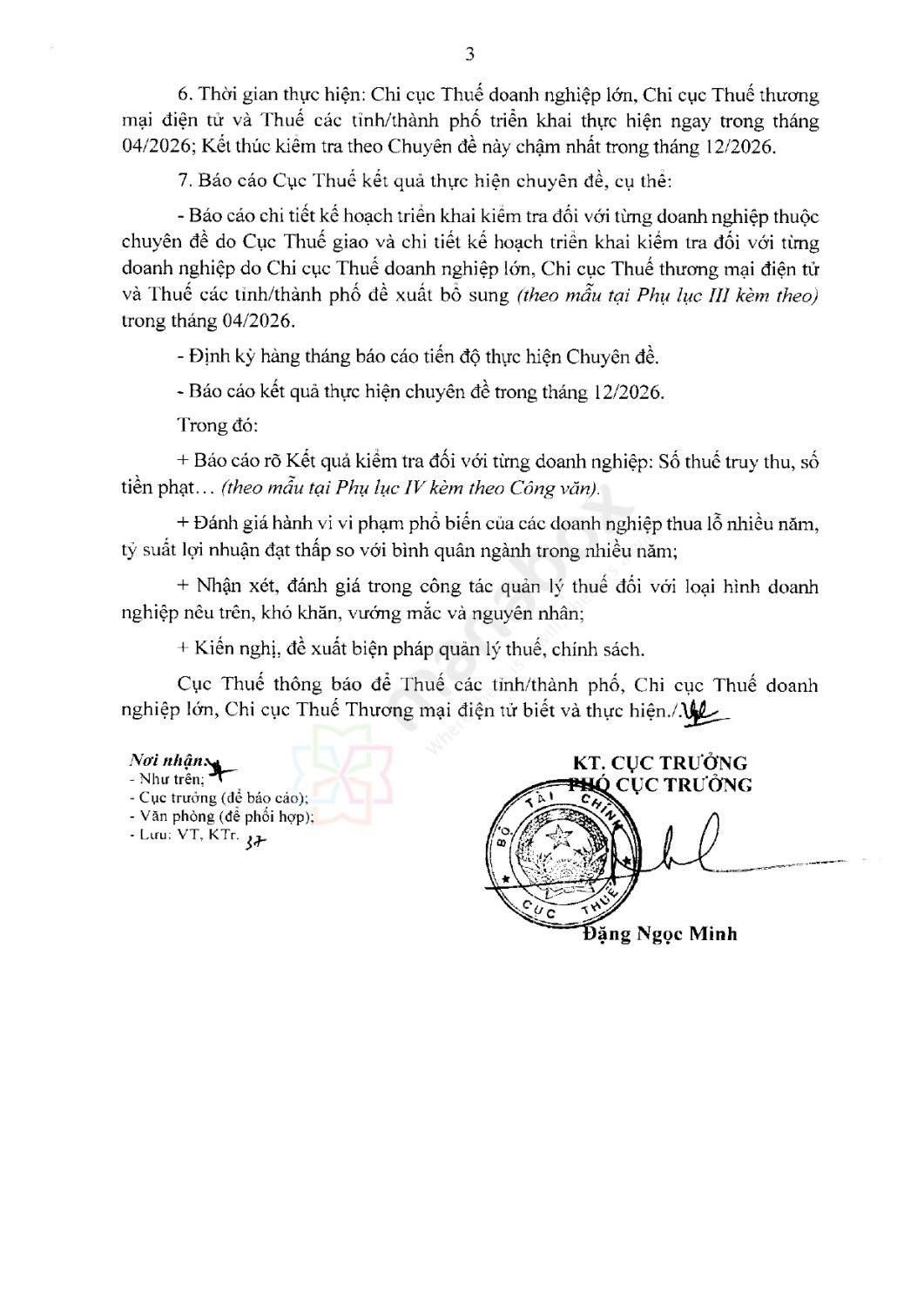 6. Thời gian thực hiện: Chi cục Thuế doanh nghiệp lớn, Chi cục Thuế thương mại điện tử và Thuế các tỉnh/thành phố triển khai thực hiện ngay trong tháng 04/2026; Kết thúc kiểm tra theo Chuyên đề này chậm nhất trong tháng 12/2026.