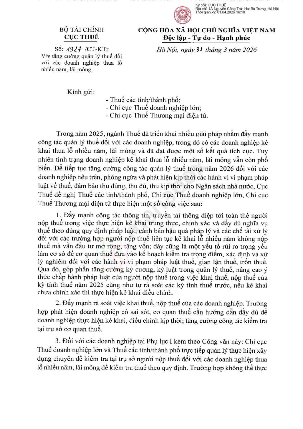 Dựa trên nội dung Công văn số 1927/CT-KTr ngày 31/3/2026 của Cục Thuế về việc thắt chặt quản lý và đẩy mạnh kiểm tra chuyên đề năm 2026 đối với nhóm doanh nghiệp thua lỗ nhiều năm kéo dài, lãi mỏng, dưới đây là bản tóm tắt và phân tích các nội dung quan trọng