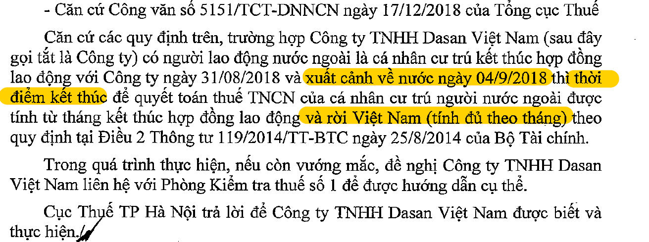 Trường hợp cá nhân cư trú là người nước ngoài kết thúc hợp đồng làm việc tại Việt Nam khai quyết toán thuế với cơ quan thuế trước khi xuất cảnh”