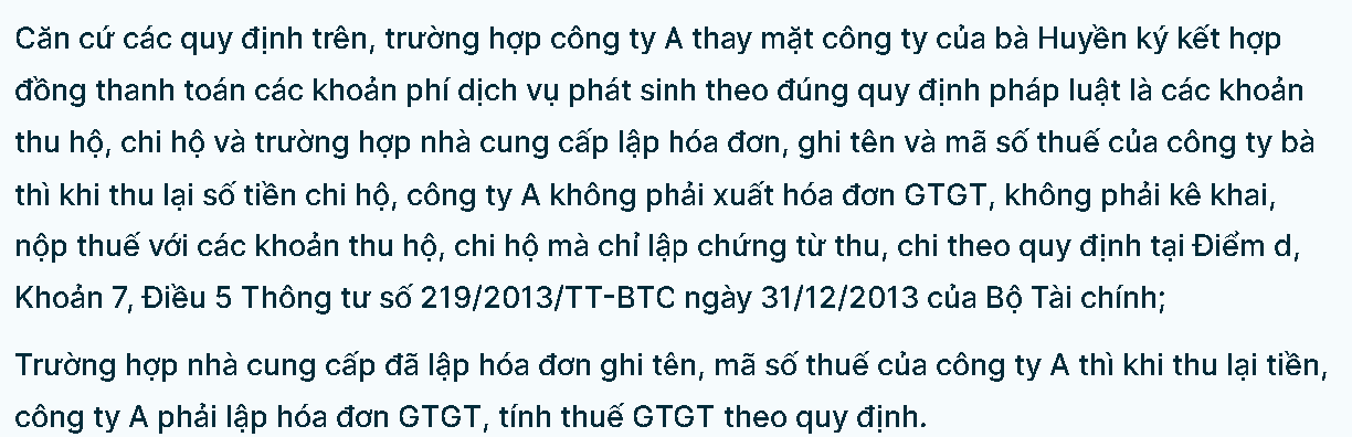 Không còn là chi hộ (hóa đơn đầu vào đứng tên bên chi hộ): khi thu lại, phải lập hóa đơn GTGT cho bên nhờ chi hộ, áp dụng thuế suất theo đúng loại hàng hóa/dịch vụ đã chi (thường là 10% hoặc 5% tùy trường hợp). Căn cứ: trả lời của Bộ Tài chính; các công văn cơ quan thuế.