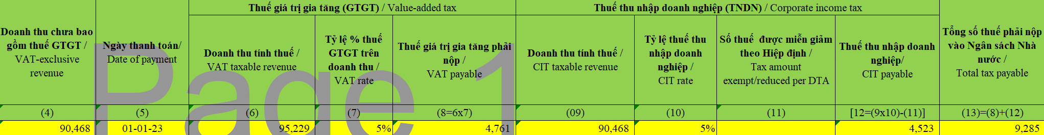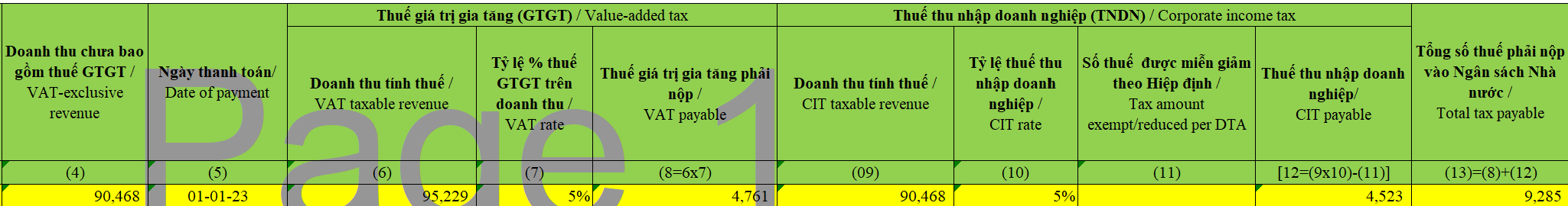 - + Thuế TNDN: 85.944/(1-5%) x 5% = 90.467 x 5% = 4.523