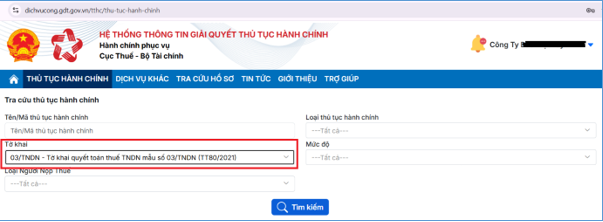 + Bước 1: NNT đăng nhập Hệ thống Thông tin giải quyết Thủ tục hành chính (TTHC) theo đường dẫn: https://dichvucong.gdt.gov.vn/, chọn chức năng “Thủ tục hành chính” và tìm kiếm theo tờ khai 03/TNDN – Tờ khai quyết toán thuế thu nhập doanh nghiệp (TT80/2021).