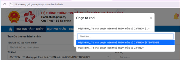 Lưu ý: Trường hợp NNT đã nộp tờ khai “03/TNDN_Tờ khai quyết toán thuế thu nhập doanh nghiệp (TT80/2021)” nhưng bỏ qua bước đính kèm phụ lục, thì NNT có thể tra cứu lại tờ khai tại chức năng “Tra cứu hồ sơ\ Tra cứu hồ sơ đã nộp” và tra cứu đến tờ khai mẫu 03/TNDN để đính kèm phụ lục tại chức năng “Bổ sung tài liệu”.