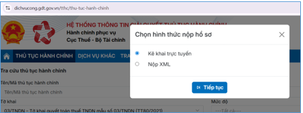 + Bước 4: Tại màn hình chọn hình thức nộp hồ sơ, NNT chọn “Kê khai trực tuyến” để kê khai trực tuyến tờ khai. Hoặc chọn chức năng “Nộp XML” để upload tờ khai XML kết xuất từ phần mềm HTKK, sau đó chọn “Tiếp tục”.
