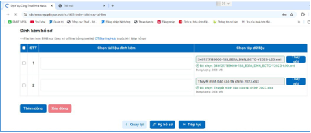 + Bước 6: Sau khi ký số tờ khai thành công, NNT chọn “Tiếp tục” để chuyển sang màn hình đính kèm tài liệu. NNT click vào biểu tượng “Chọn” để chọn phụ lục đính kèm tờ khai là báo cáo tài chính và những phụ lục khác.