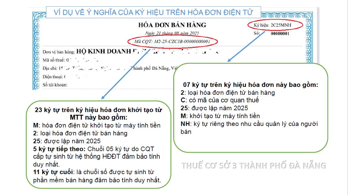 Ví dụ: Ký hiệu “1C25TAA” cho thấy đây là hóa đơn giá trị gia tăng có mã của cơ quan thuế lập trong năm 2025, do doanh nghiệp đăng ký sử dụng.